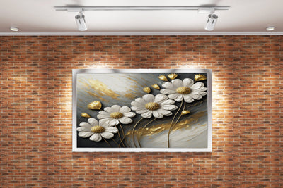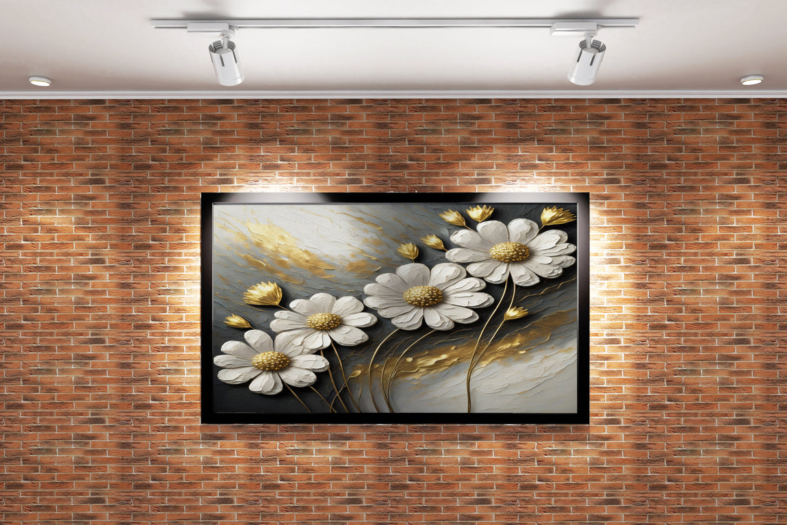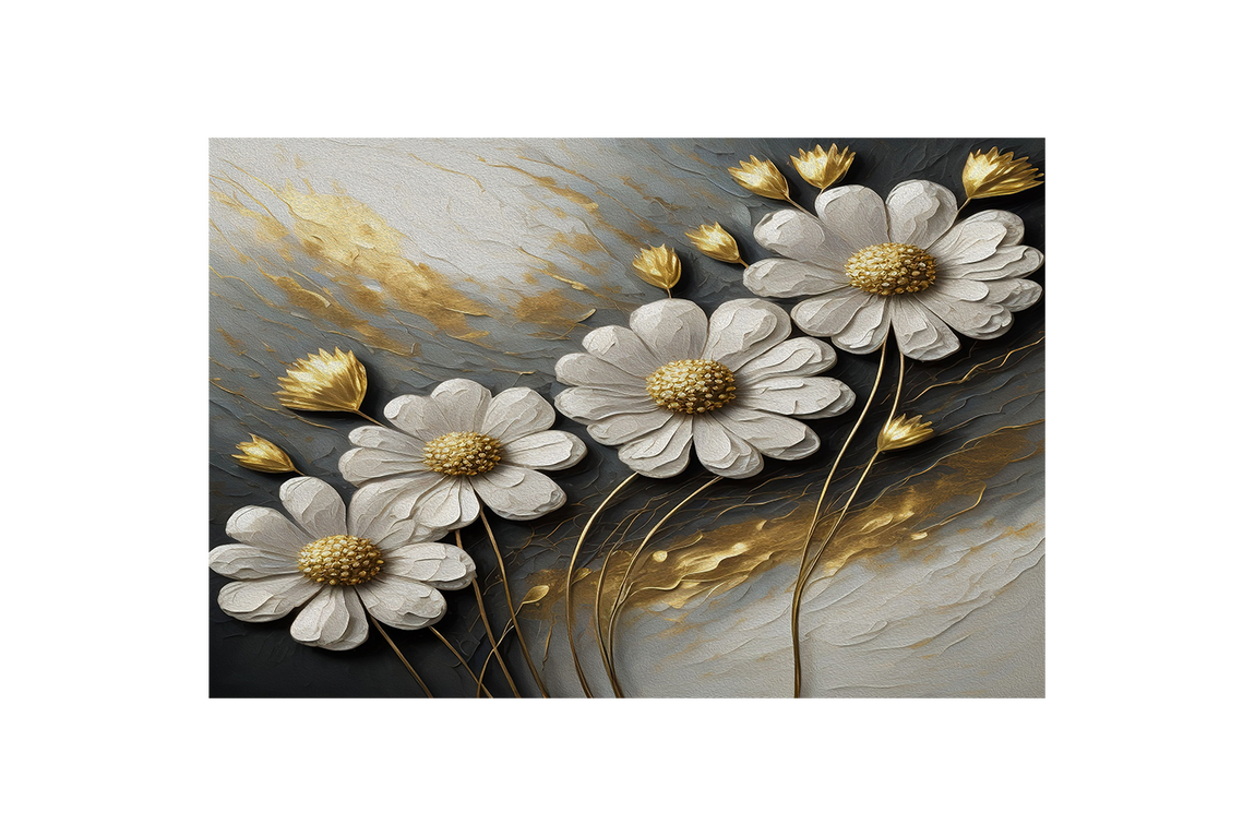3d white daisies with golden centers on a grey and gold impasto background, flower motif, art, kanvas tablo