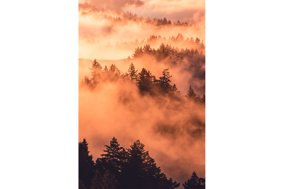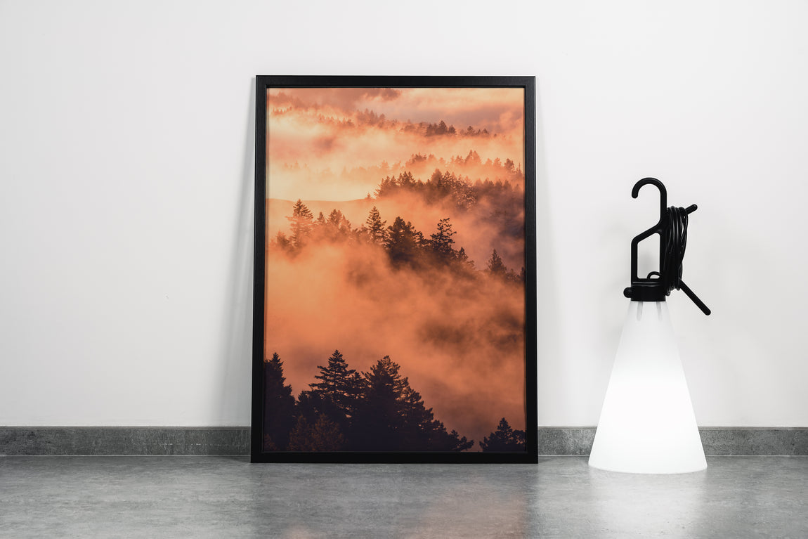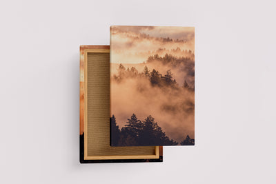 a beautiful landscape of foggy mountains with layers of trees at golden hour sunrise, abstract, art, kanvas tablo