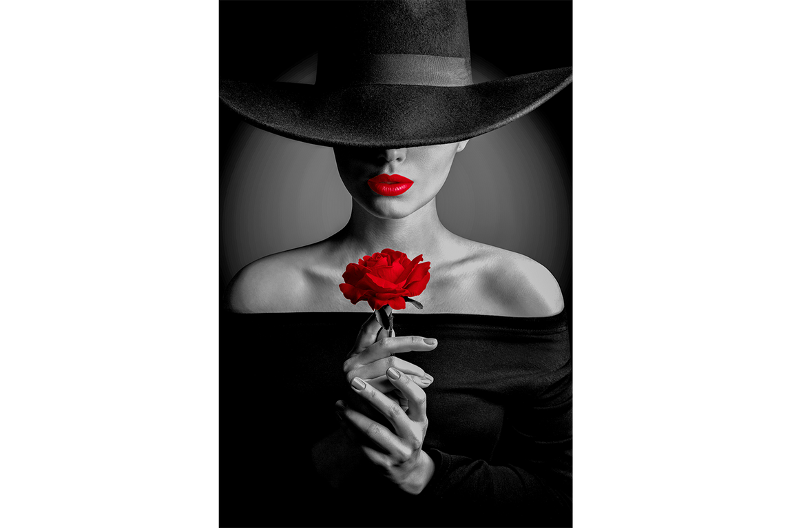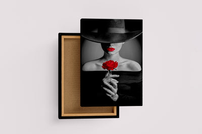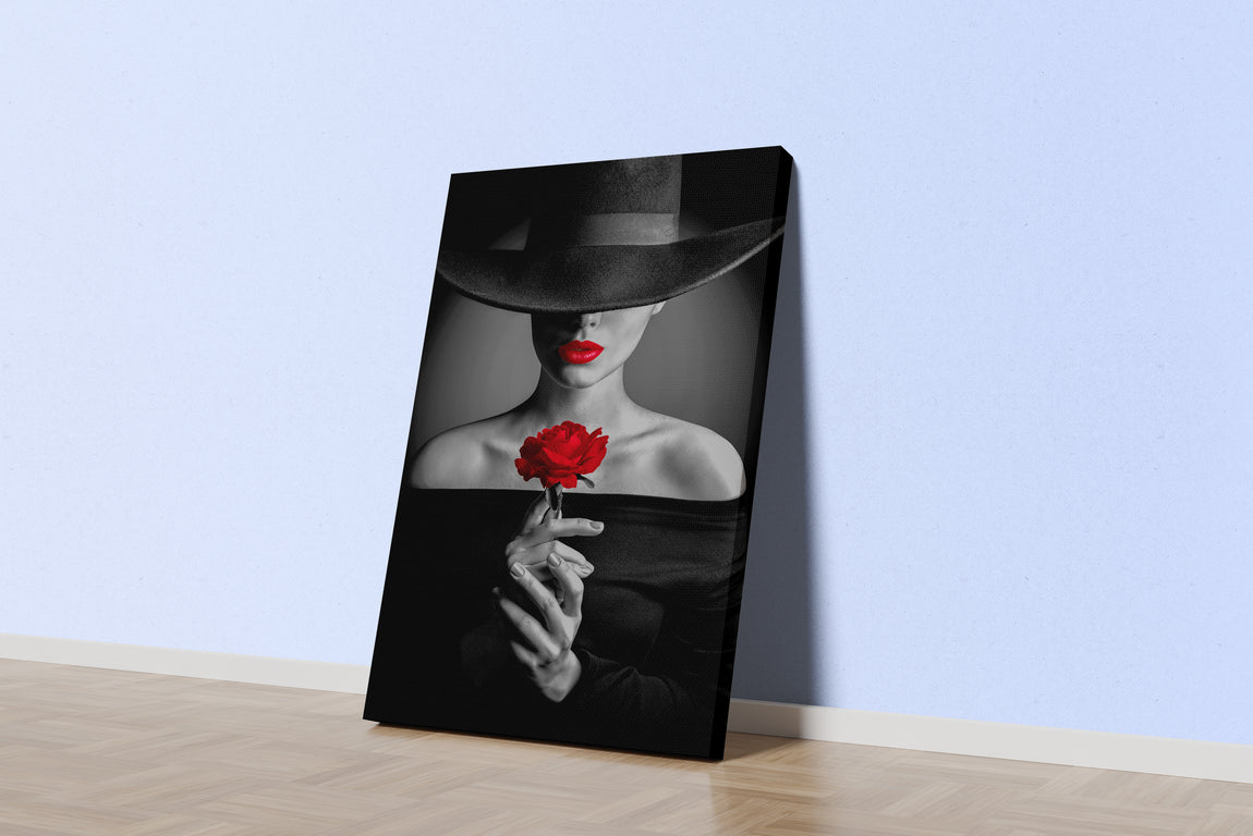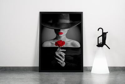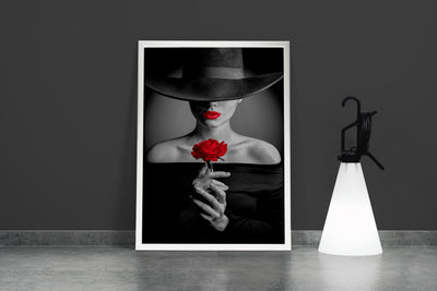 Siyah-beyaz görselin içinde kırmızı gül ve dikkat çekici kırmızı dudak detayları, zarif ve etkileyici bir atmosfer sunar. Baskı üzerinde özenle işlenen renk kontrastları, odanıza çarpıcı bir estetik katacak. Kaliteli baskı malzemesi, canlı renklerin uzun süre kalıcı olmasını sağlar ve duvar dekorasyonunuza sofistike bir dokunuş getirir.