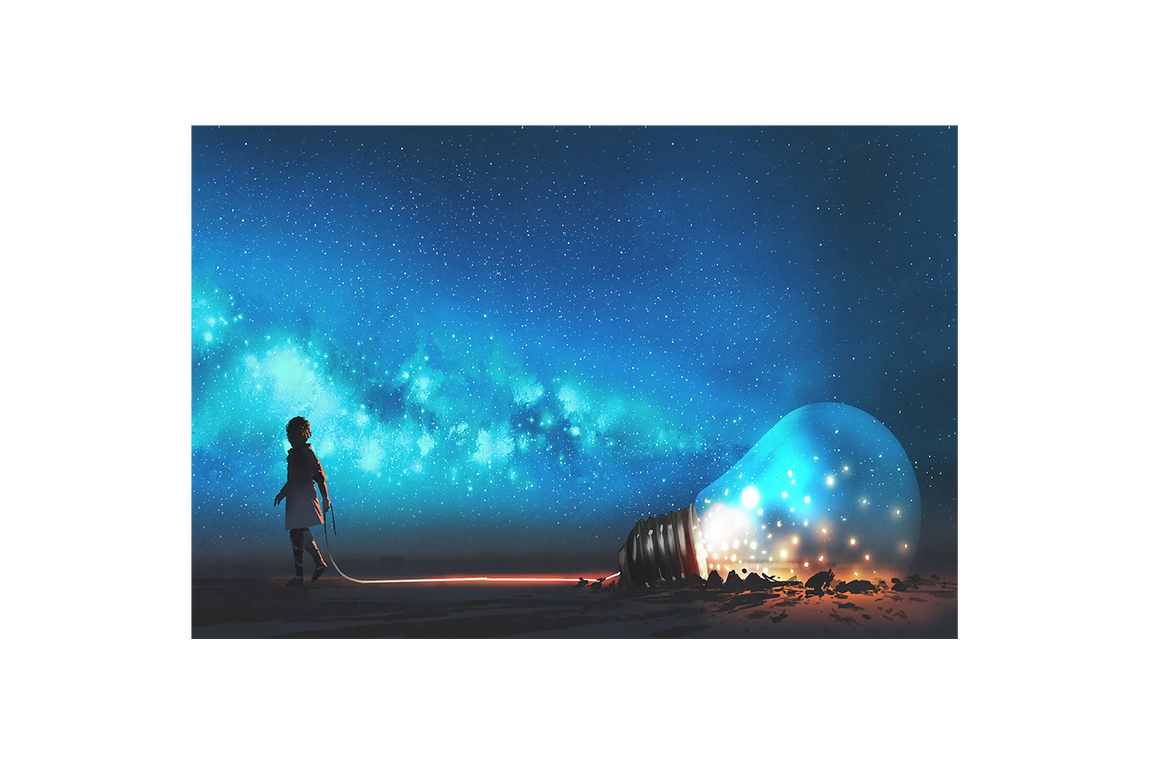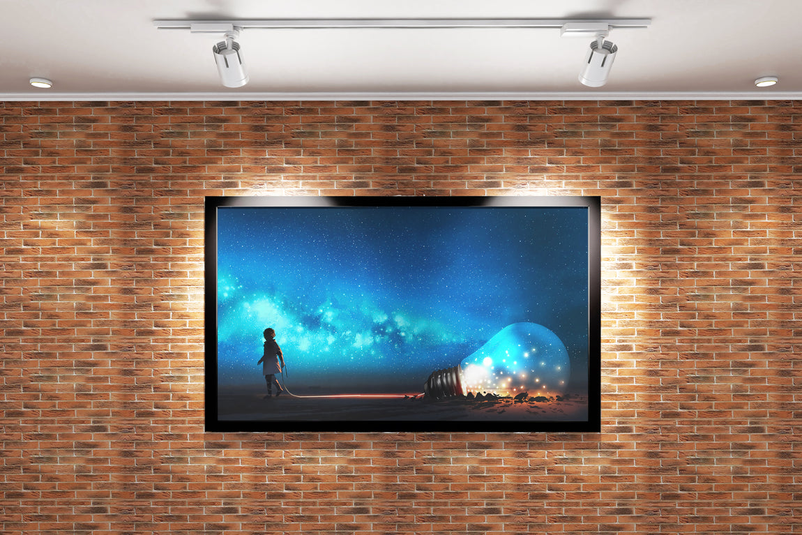a child pulling a giant lightbulb full of stars across a starry landscape, ai art, art, kanvas tablo