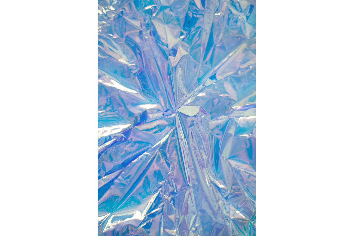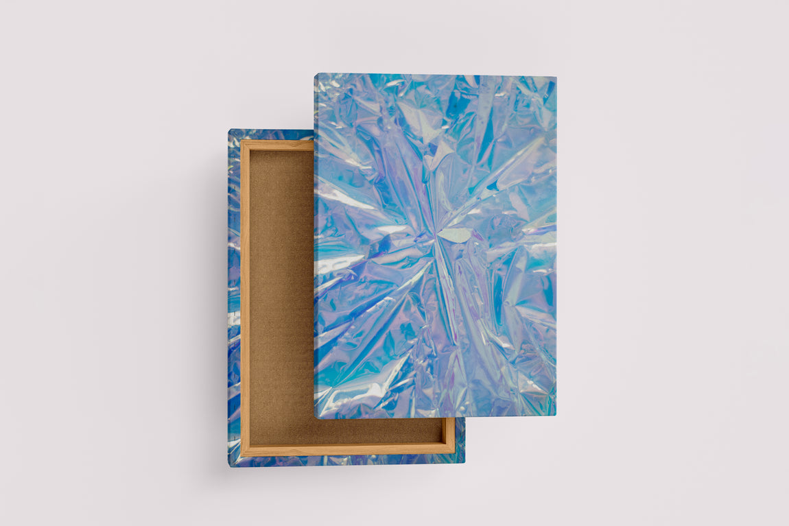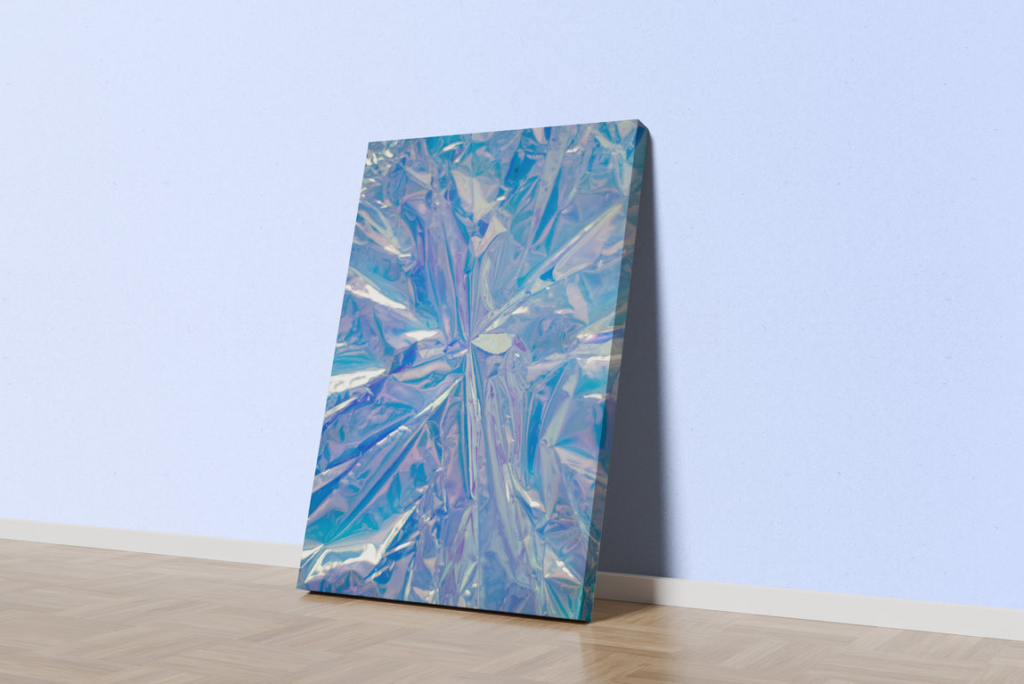 a close-up of a crumpled, futuristic holographic material with iridescent blue and purple reflections, abstract, art, kanvas tablo