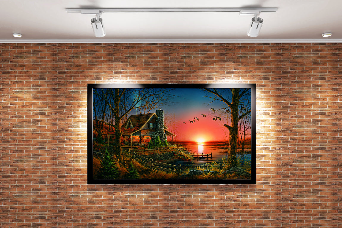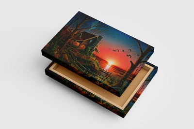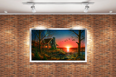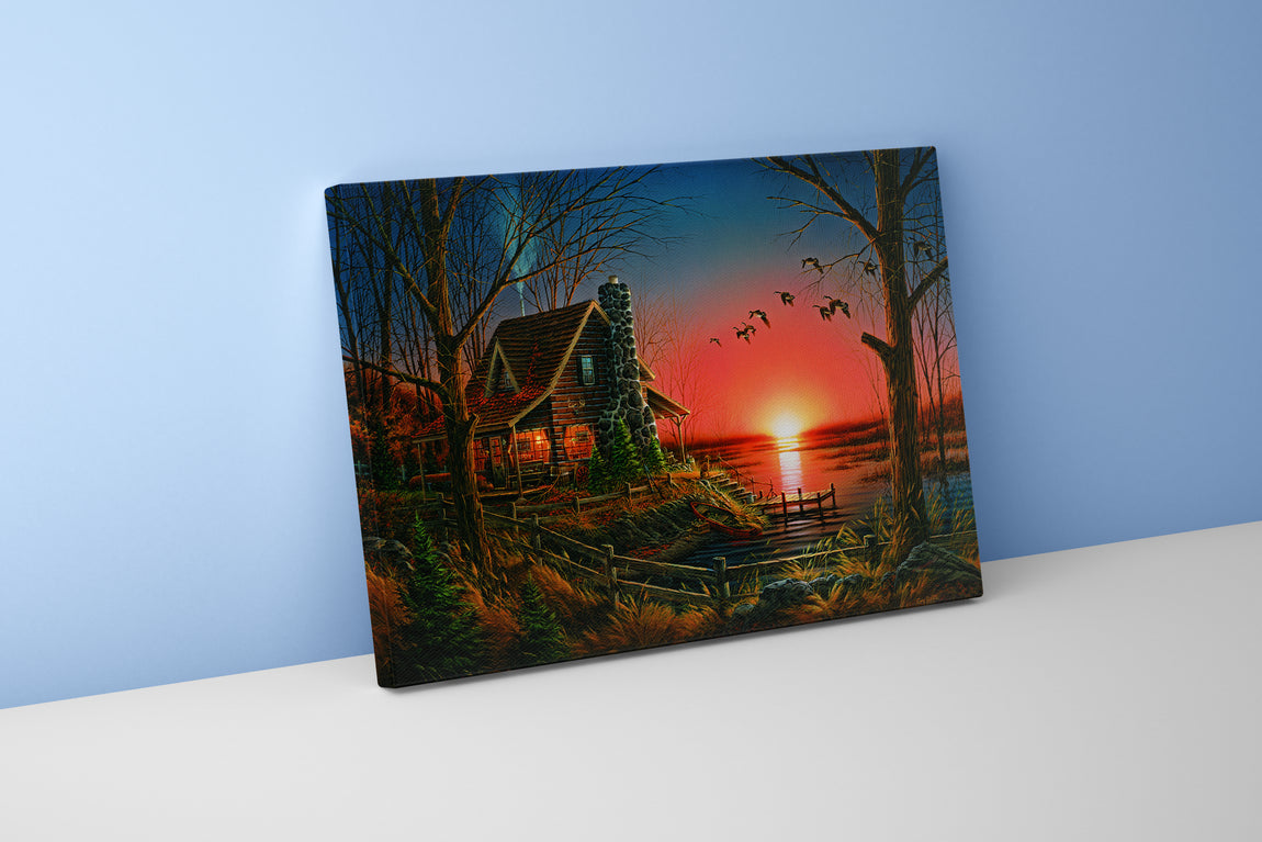 Kırmızı günbatımının sıcak ışıklarıyla aydınlanan göl kenarındaki ahşap kulübe, detaylarıyla etkileyici bir şekilde baskıya dönüştürülmüştür. Gökyüzünde süzülen kazlar, kompozisyona hareket ve canlılık katar. Canlı renkler ve net detaylar, mekanınıza samimi ve huzurlu bir atmosfer getirir. Kaliteli baskı tekniği sayesinde uzun süre solmadan dekorasyonunuza şıklık katar. Doğa tutkunları için ideal bir estetik dokunuş sunar.