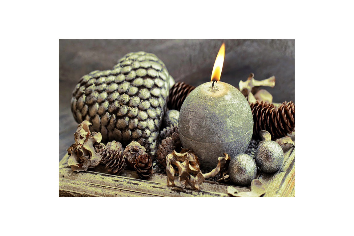 a cozy, rustic winter display with a lit candle, pinecones, and a heart, art, kanvas tablo