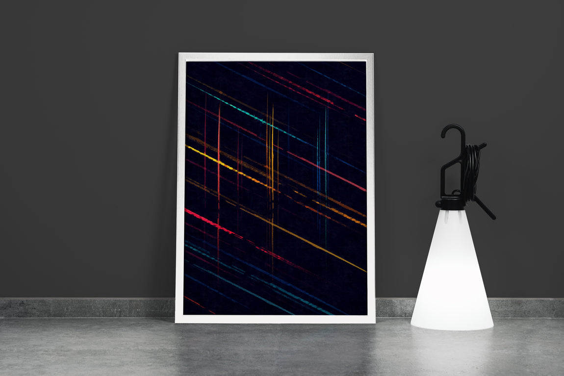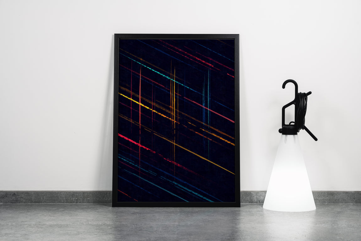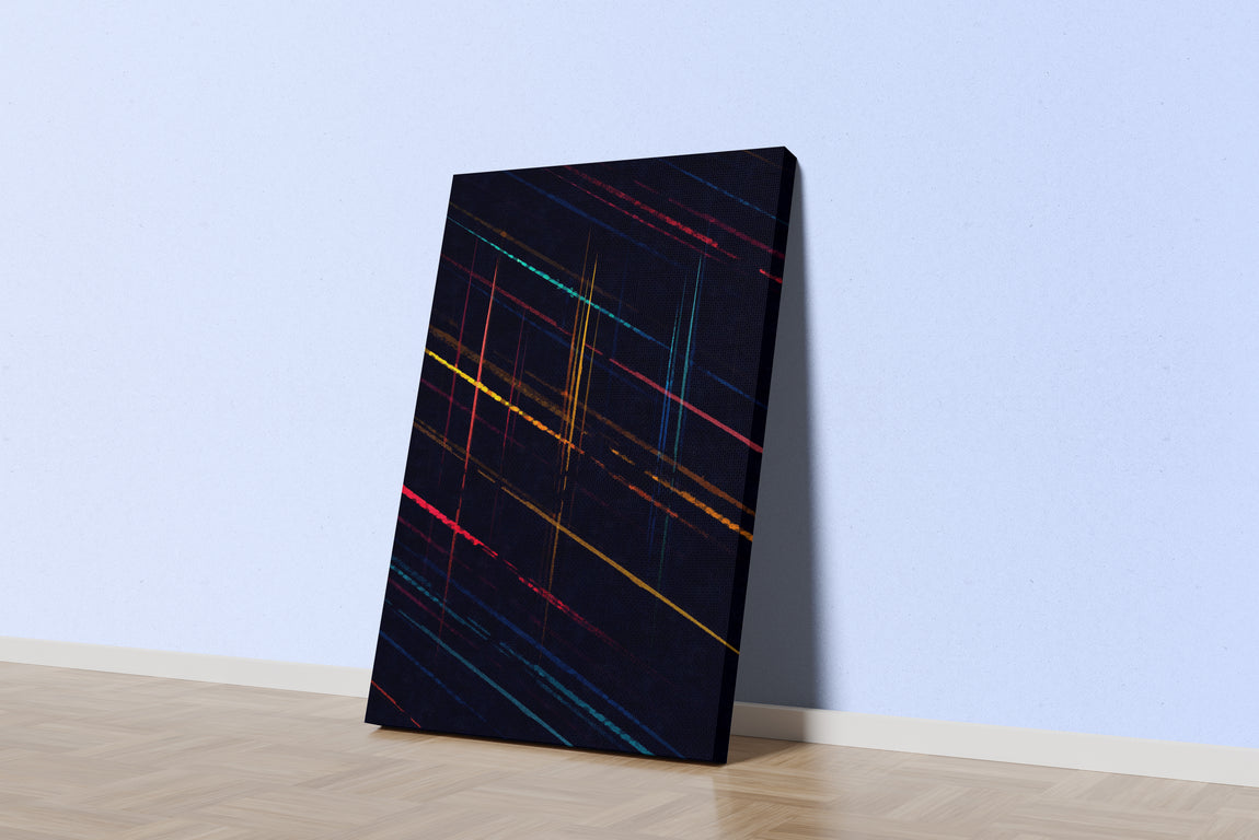 Renkli ince çizgilerin dinamik hareketi, koyu arka planla güçlü bir kontrast oluşturuyor. Baskı kalitesi, her detayı net ve canlı yansıtıyor; modern dekorasyonlarda mekâna derinlik ve hareket katmak için ideal. Bu sanatsal seçim, ortamınıza sofistike ve enerjik bir dokunuş sağlar.