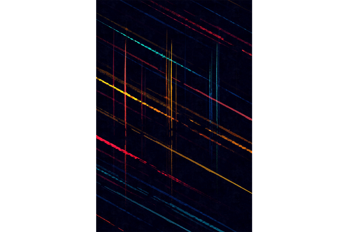 a dark abstract background with thin, colorful, diagonal lines streaking across the canvas, abstract, art, kanvas tablo