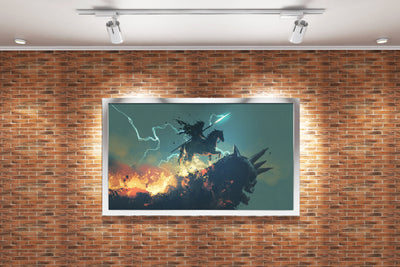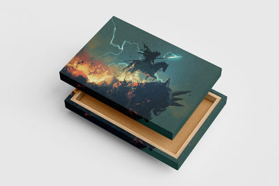 Karanlık bir şövalyenin alevler ve yıldırımlar arasında, efsanevi bir ejderhanın üzerinde durduğu etkileyici sahne, yüksek kaliteli kanvas üzerine baskı ile hayat buluyor. Canlı renkler ve detaylar, duvarınıza güç ve gizem katarken, dayanıklı malzemesi uzun ömürlü kullanım sağlar. Bu baskı, ev veya ofis dekorasyonunuza çarpıcı bir atmosfer getirmek için ideal.