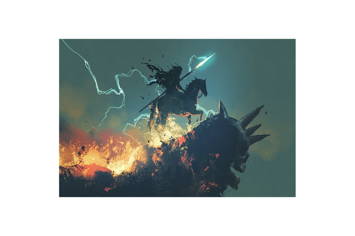 a dark knight on horseback on a slain dragon amidst fire and lightning, ai art, art, kanvas tablo