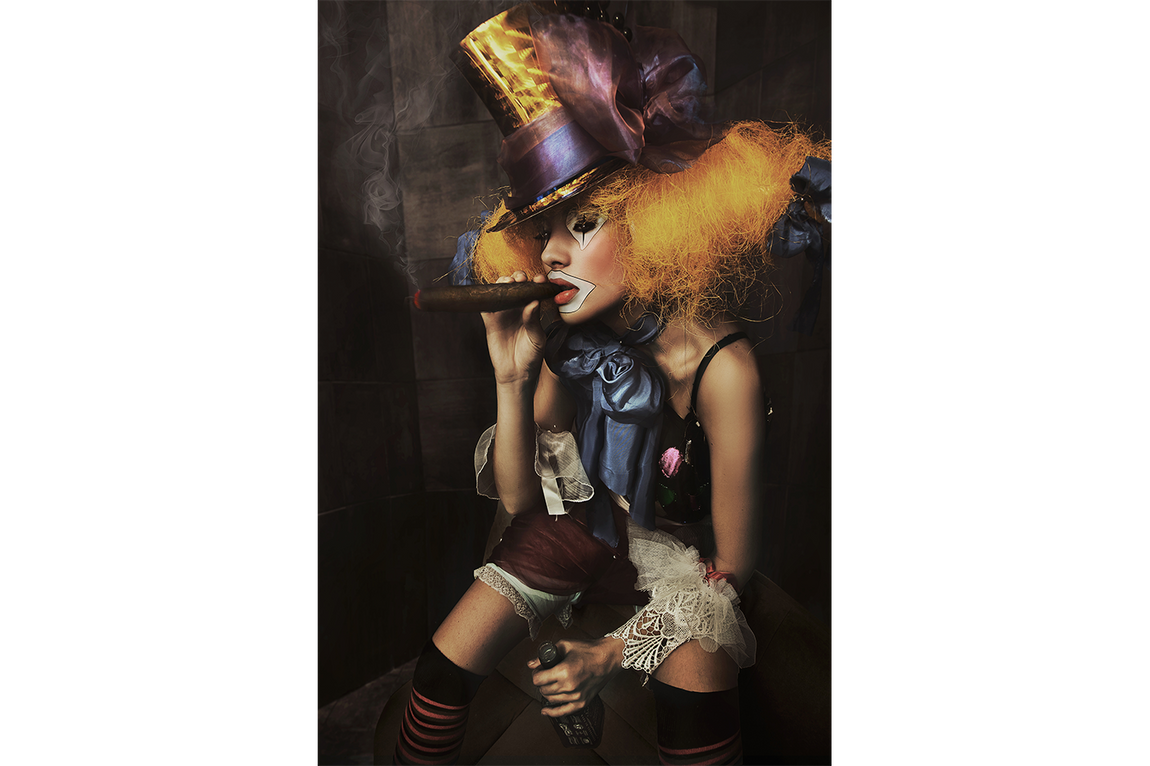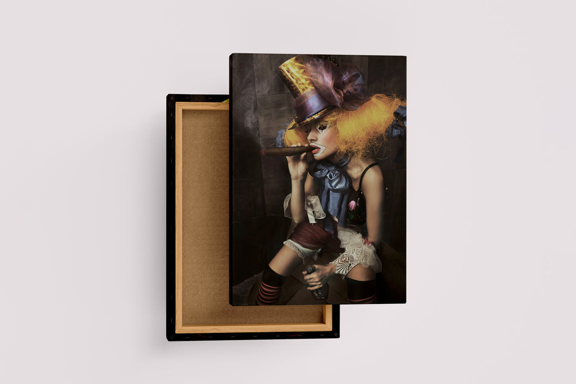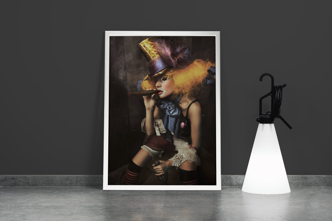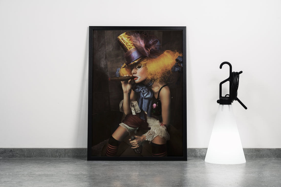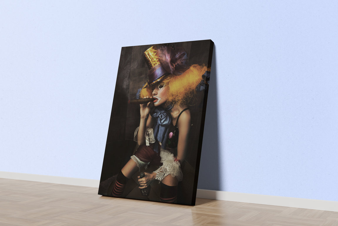 a decadent female clown with wild orange hair smoking a large cigar, art, kanvas tablo