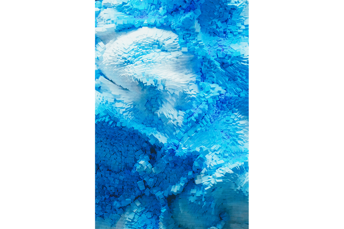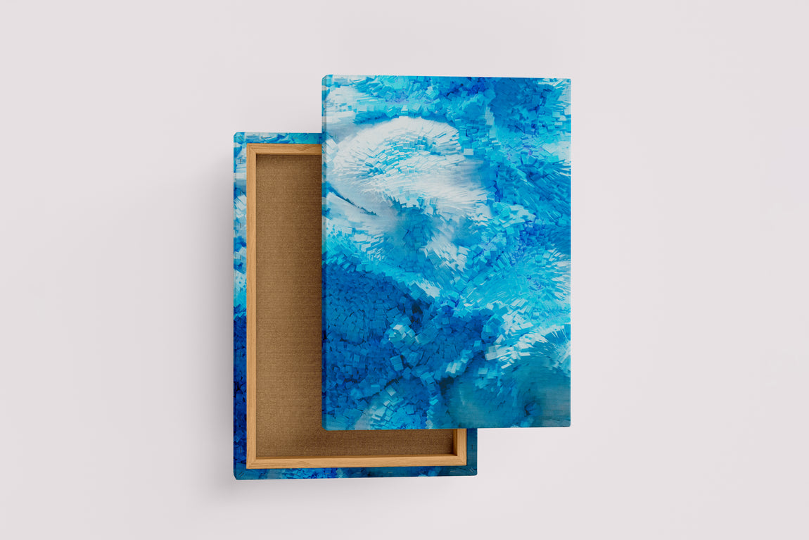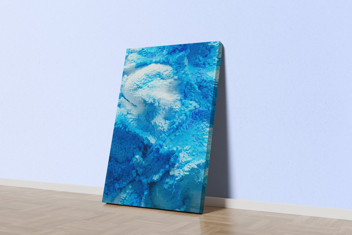 a digital abstract artwork showing an explosion of light blue three-dimensional pixel-like shapes, abstract, art, kanvas tablo