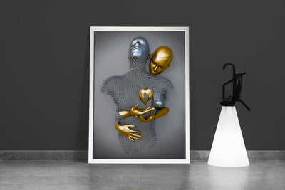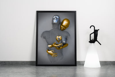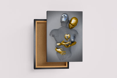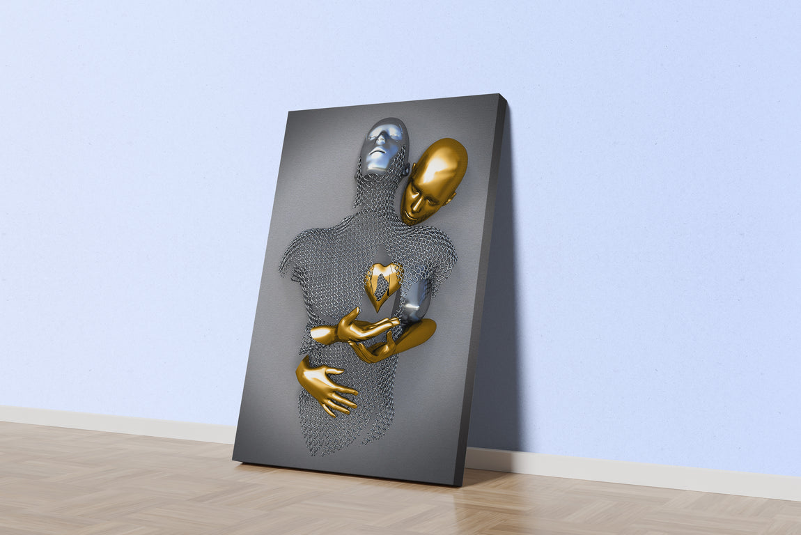 Altın rengi figürün gümüş zırh giymiş bir başka figüre sarılması, baskının her detayında zarafet ve anlam taşıyor. Kalp figürünün yerleştirilişi, duygusal bir bağın görsel yansıması olarak sıcaklık katıyor. Uzun yıllar canlı kalacak yüksek kalite kanvas üzerine uygulanmış bu baskı, mekanınıza özgün bir estetik ve derinlik kazandırır. Sanatseverler için anlam dolu, etkileyici bir dekorasyon çözümüdür.