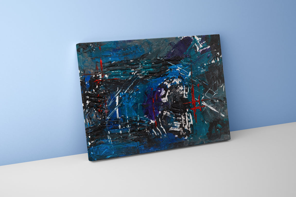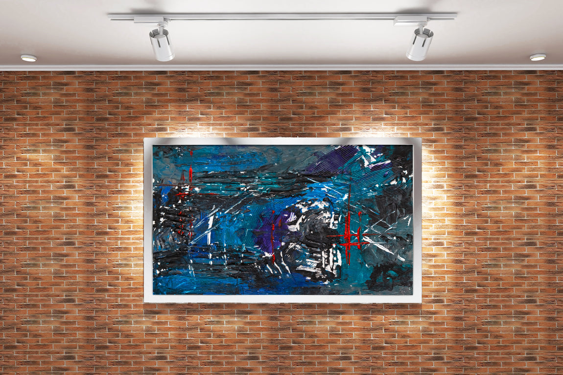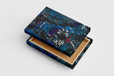 Derin mavi tonlarla ve kırmızı çizgisel vurgularla hayat bulan bu baskı, yoğun dokusuyla mekanlarınıza derinlik katıyor. Soyut detayları sayesinde her bakışta farklı bir yorum sunar, mekânınıza sanatsal bir atmosfer getirir. Kaliteli baskı teknolojisiyle, renklerin canlılığı ve dokunun özgünlüğü uzun ömürlü şekilde korunur. Modern dekorasyonunuza güçlü ve çarpıcı bir dokunuş sağlamak için ideal bir seçim.