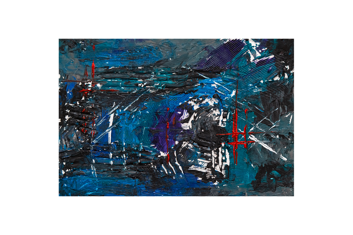 a heavily textured dark abstract painting with deep blue tones and red linear accents, abstract, art, kanvas tablo