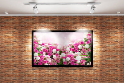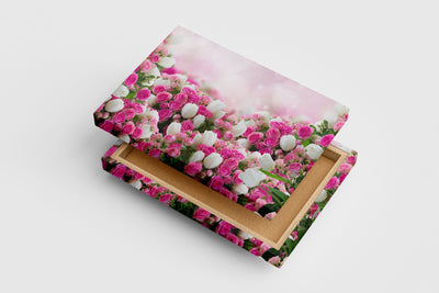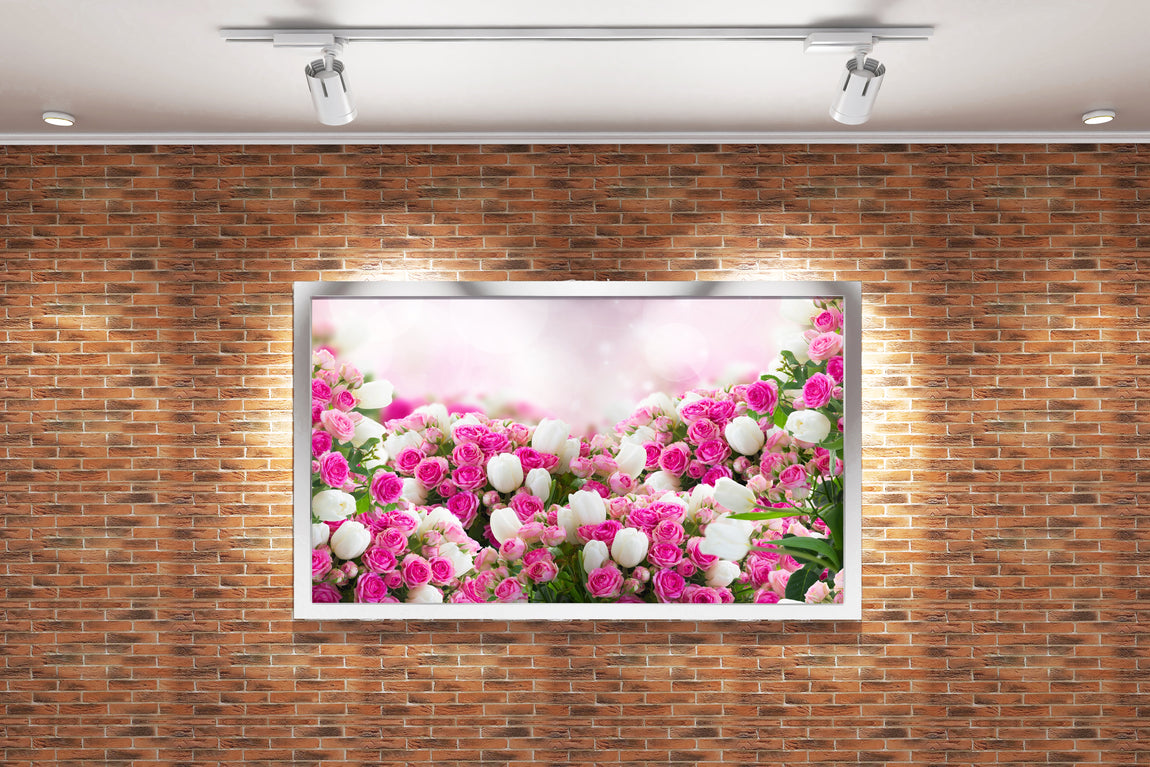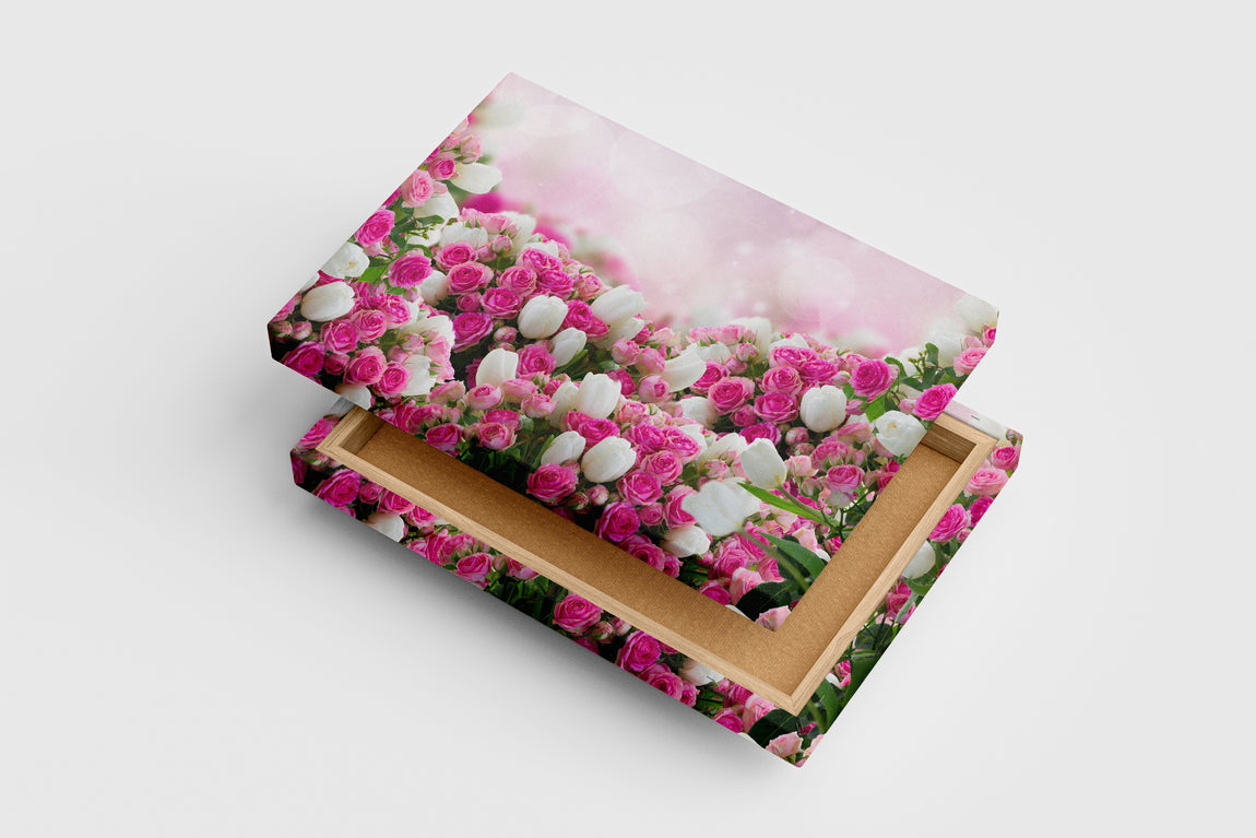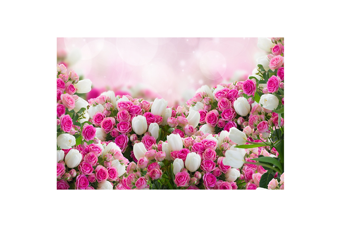 a lush bed of pink roses and white tulips on a sparkling bokeh background, flower motif, art, kanvas tablo