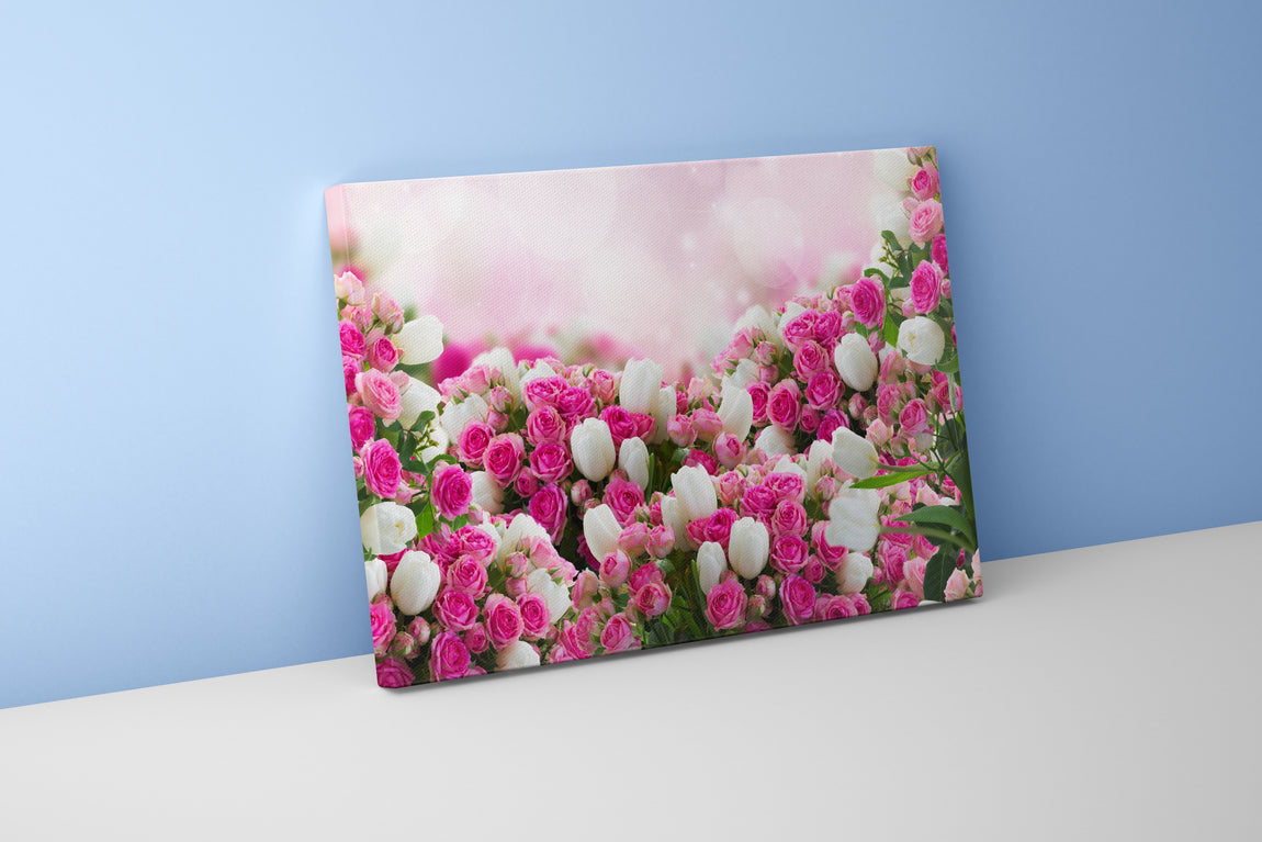 Canlı pembe güller ve beyaz lalelerin zarif detaylarıyla bezeli bu kanvas tablo, parıldayan bokeh arka planıyla ortamınıza şıklık katacak. Yüksek kaliteli baskısı sayesinde renkler uzun süre canlı kalır ve dekorasyonunuza estetik bir dokunuş sağlar. Hem modern hem de doğal atmosfer yaratmak isteyenler için ideal bir seçim.