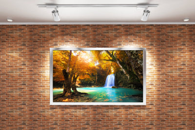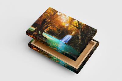 a magical waterfall in a golden autumn forest with fish in turquoise water, view, art, kanvas tablo