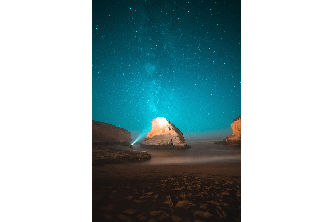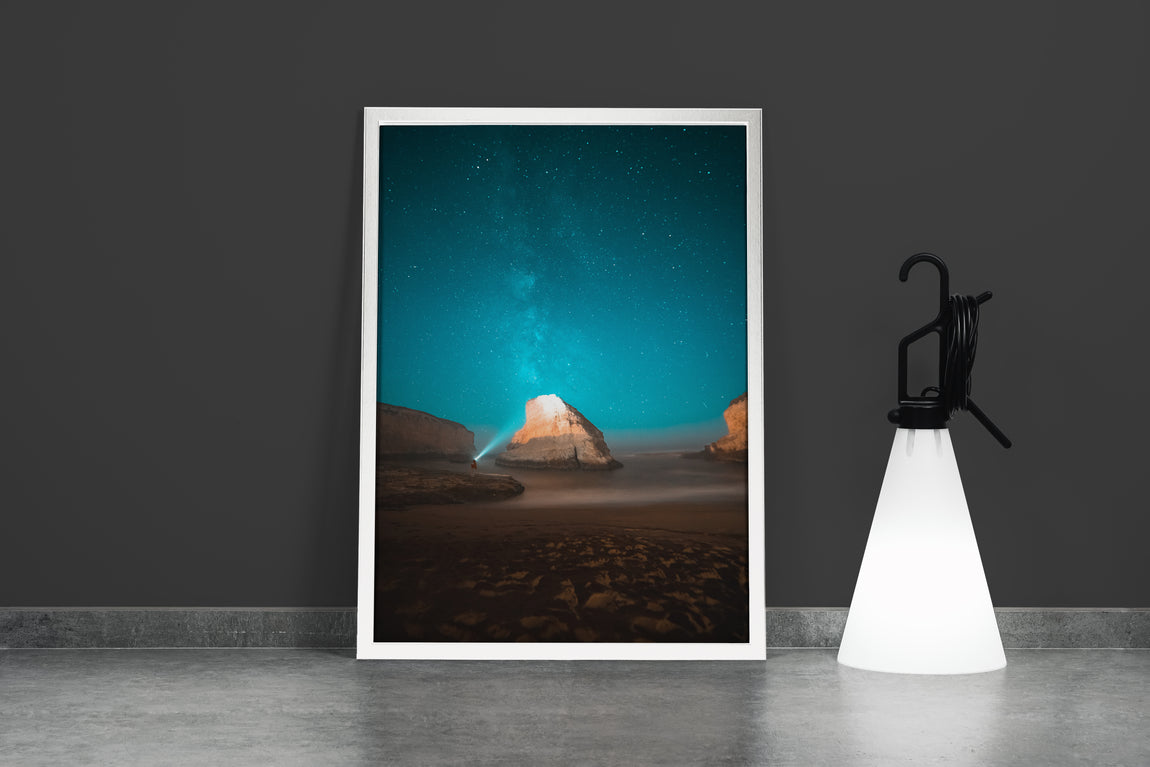 a man on a beach at night, illuminating a sea stack under the milky way, art, kanvas tablo