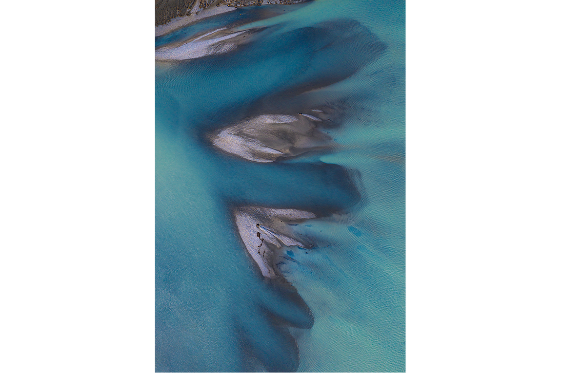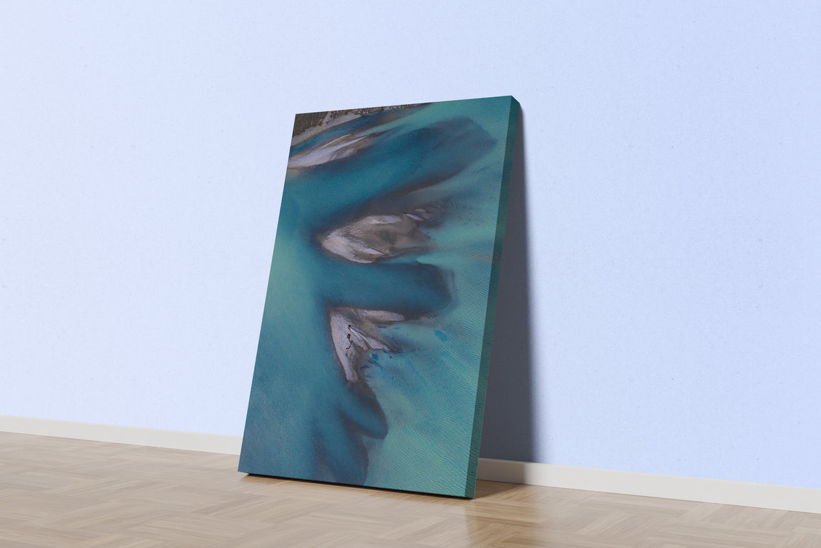 a minimalist aerial photograph of sandbars creating abstract shapes in calm, blue-grey water, abstract, art, kanvas tablo