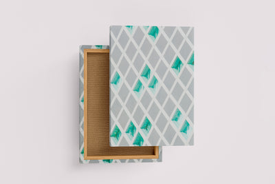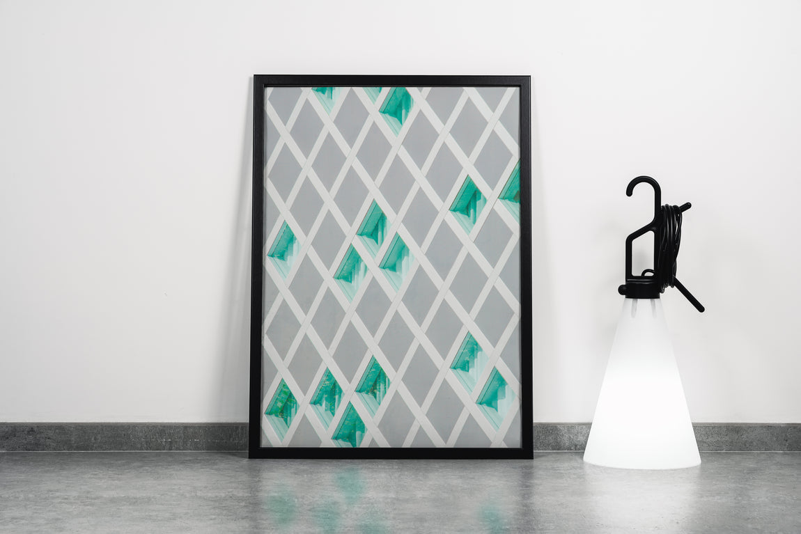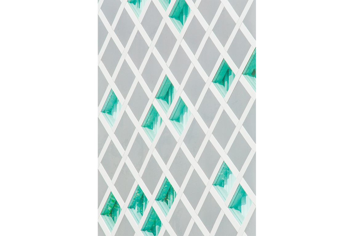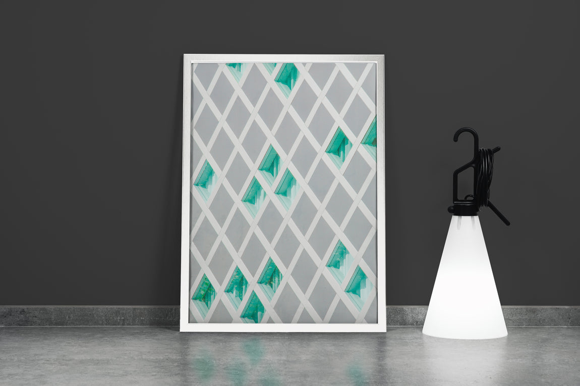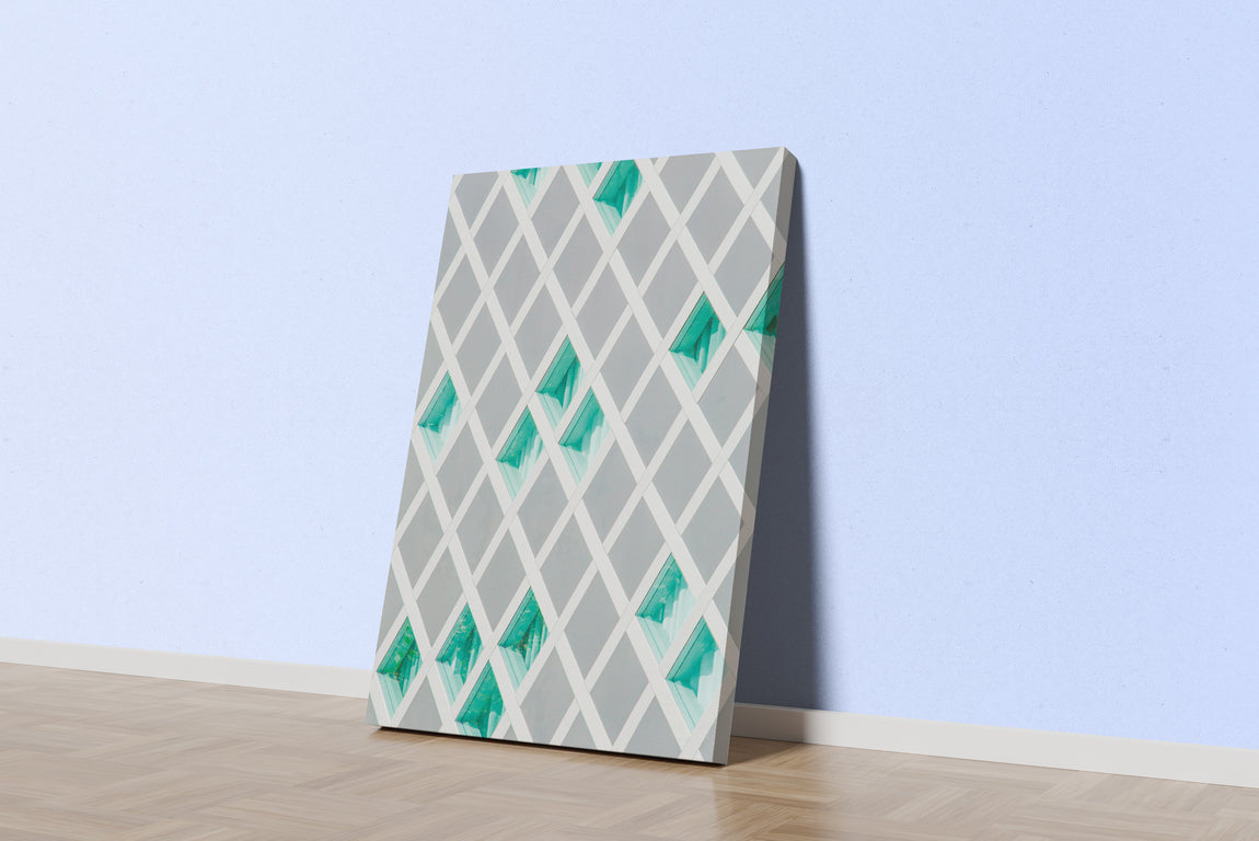 a minimalist architectural facade with a white diagonal lattice over turquoise glass windows, abstract, art, kanvas tablo
