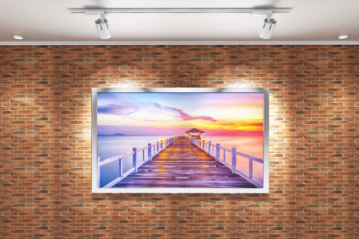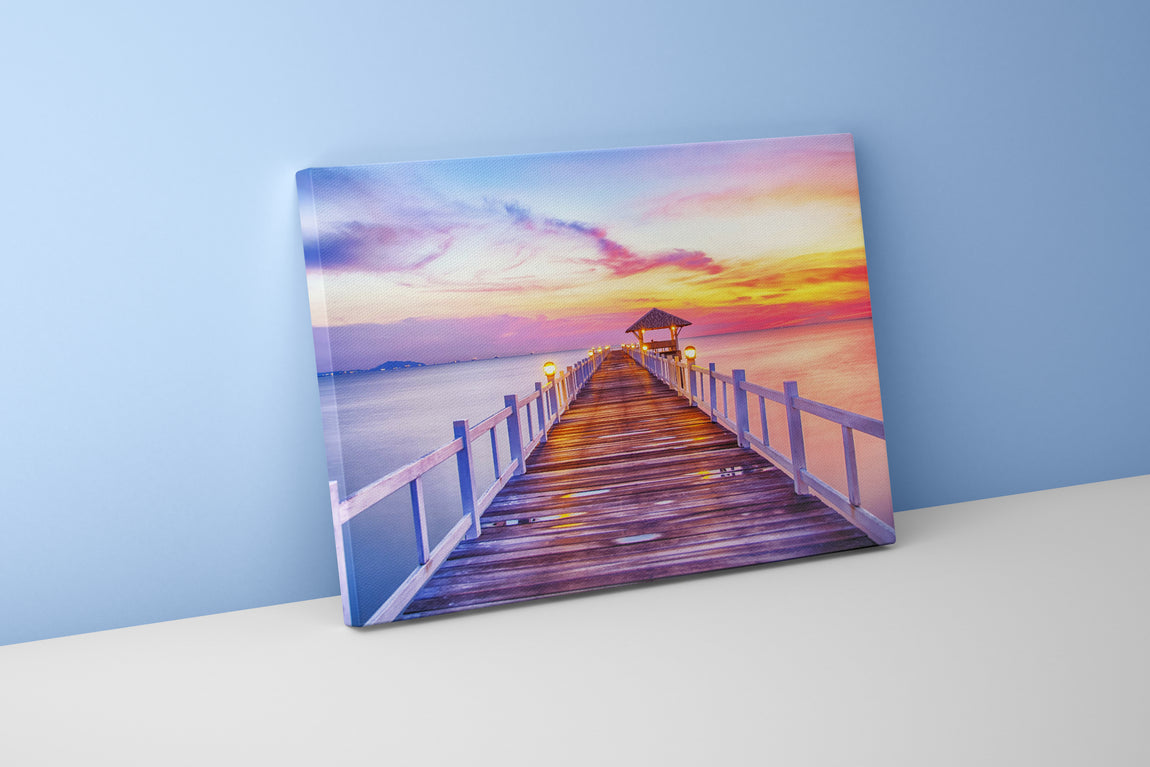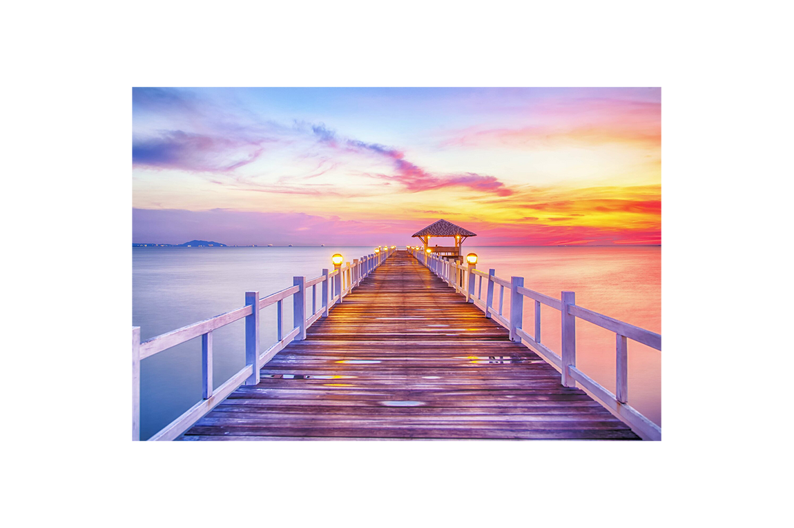 a peaceful wooden pier with glowing lamps leading to a vibrant ocean sunset, view, art, kanvas tablo