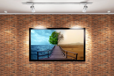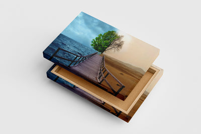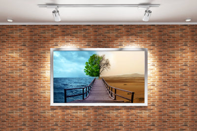 a pier to a split tree, one side lush ocean, one side barren desert, view, art, kanvas tablo