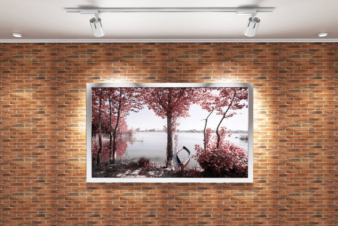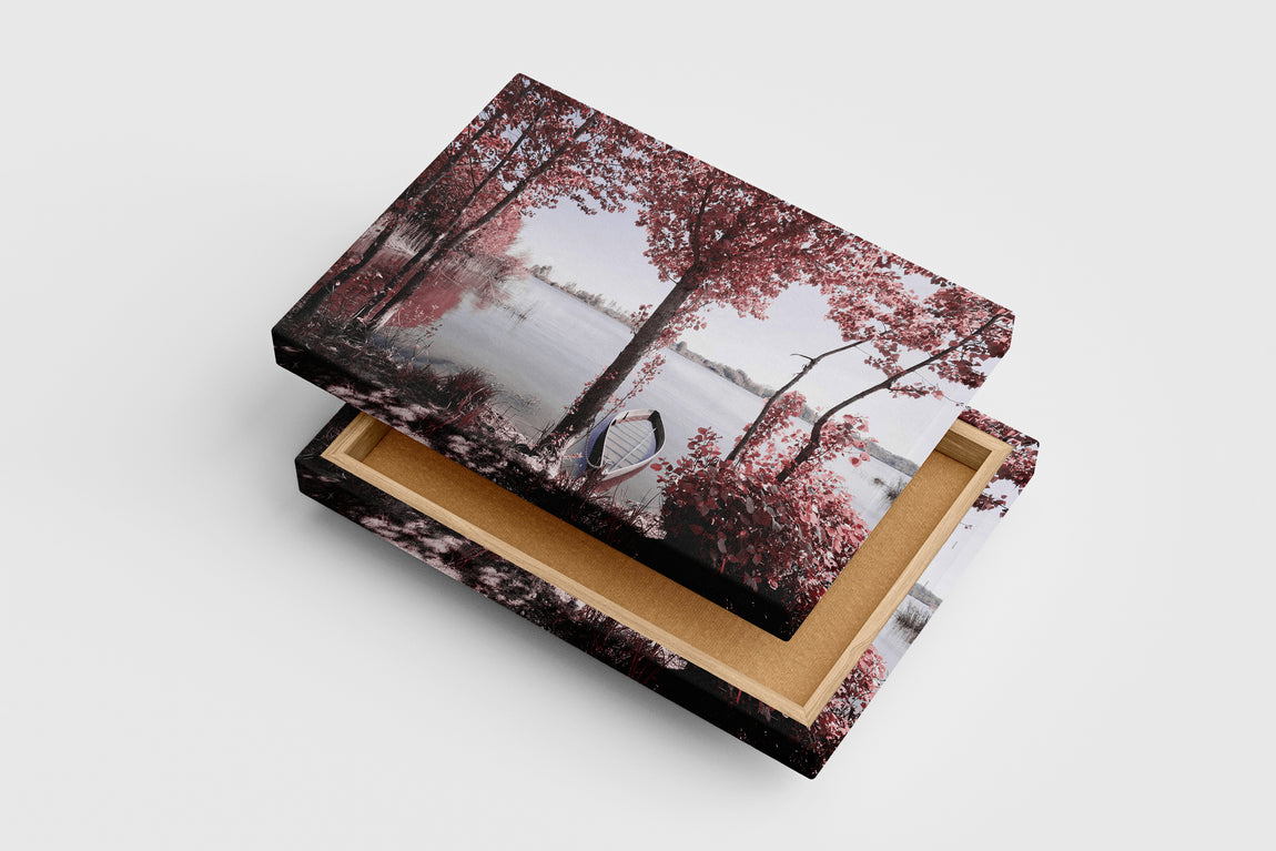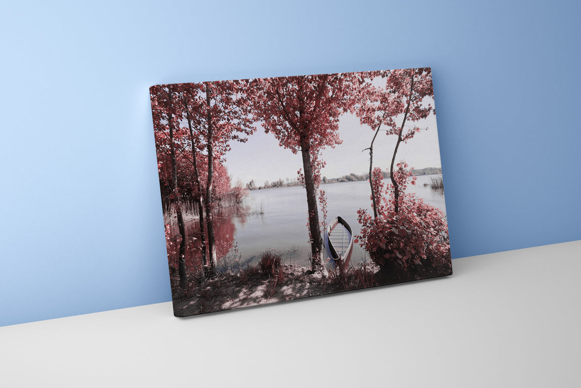 Pembe yapraklı ağaçların çevrelediği huzurlu ve sürreal bir göl manzarasının yüksek kaliteli baskısı, yaşam alanlarınıza dinginlik ve estetik katar. İnce detaylarla özenle işlenen görsel, suyun yansıması ve küçük tekne detayıyla derinlik hissi sunar. Dayanıklı kanvas ve canlı renkler uzun ömürlü kullanım sağlar, dekorasyonunuza zarif bir dokunuş ekler.