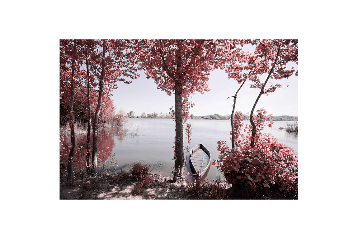 a serene and surreal lake with pink-leafed trees and a small boat, view, art, kanvas tablo