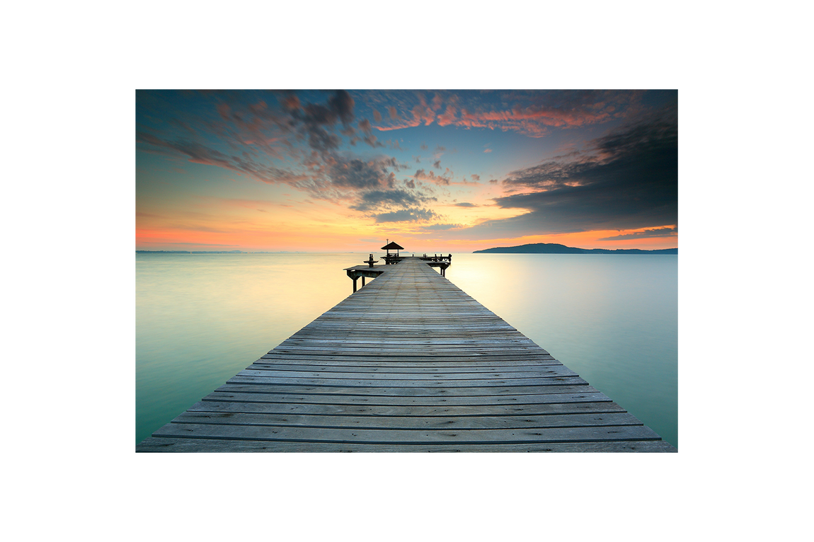 a serene long exposure of a wooden pier over a glassy sea at sunset, view, art, kanvas tablo