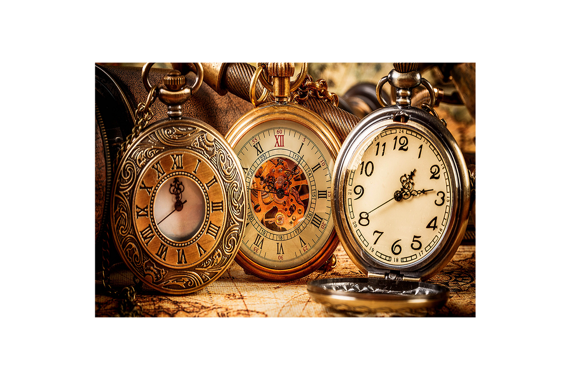a still life of ornate, vintage pocket watches on an old world map, art, kanvas tablo