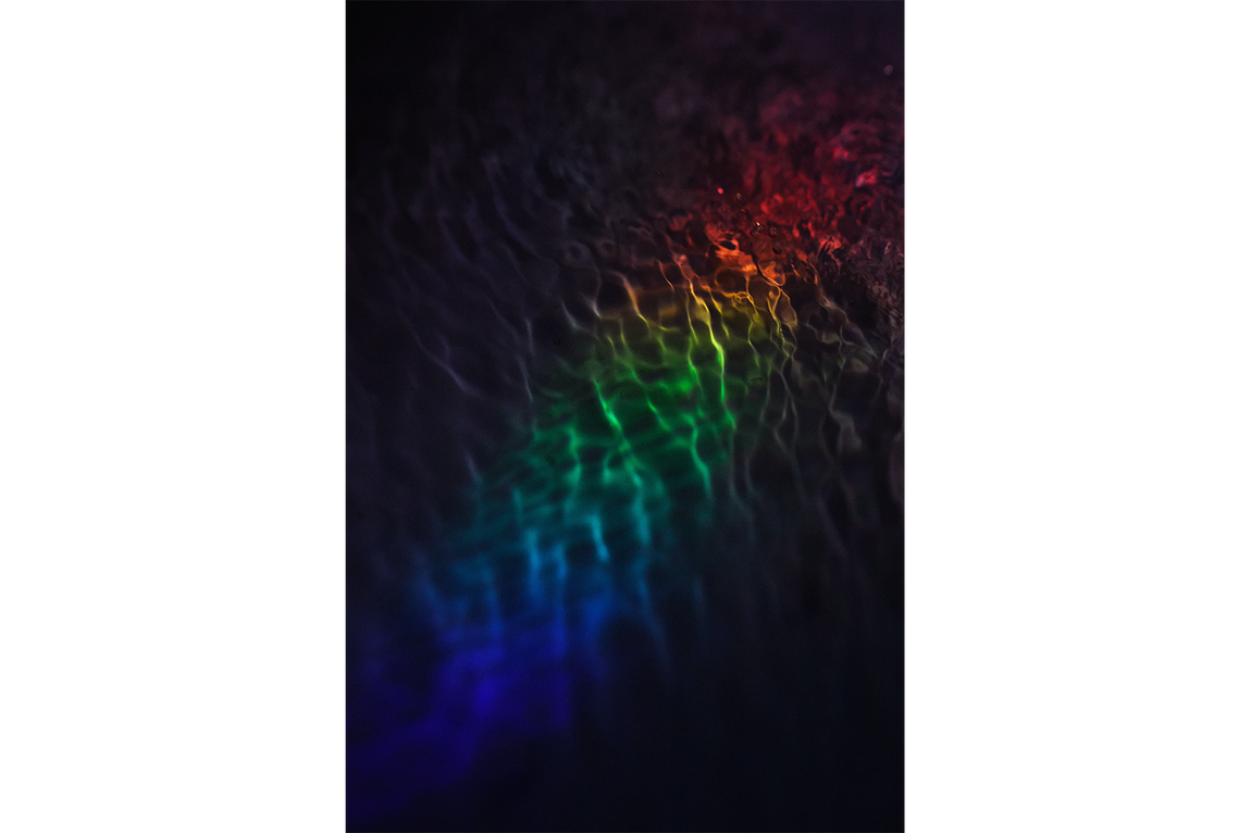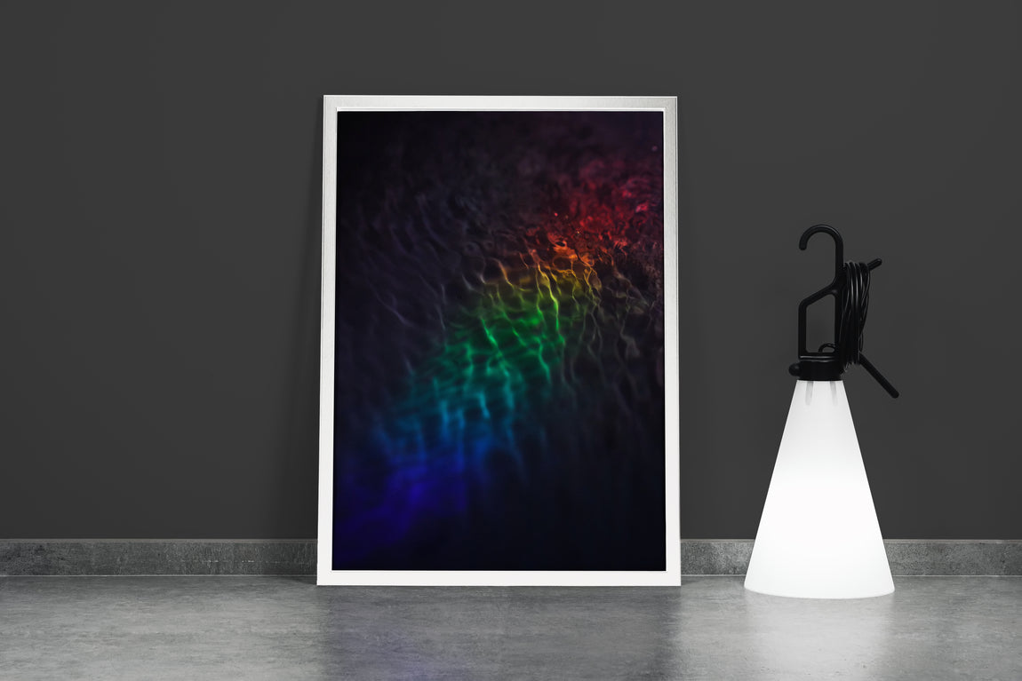 a subtle and dark photograph of rainbow-colored light refracting on gentle water ripples, abstract, art, kanvas tablo