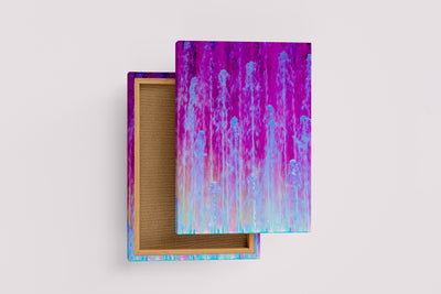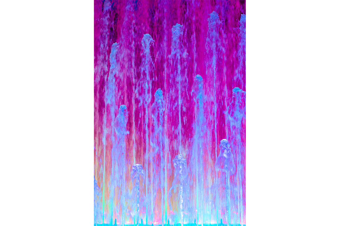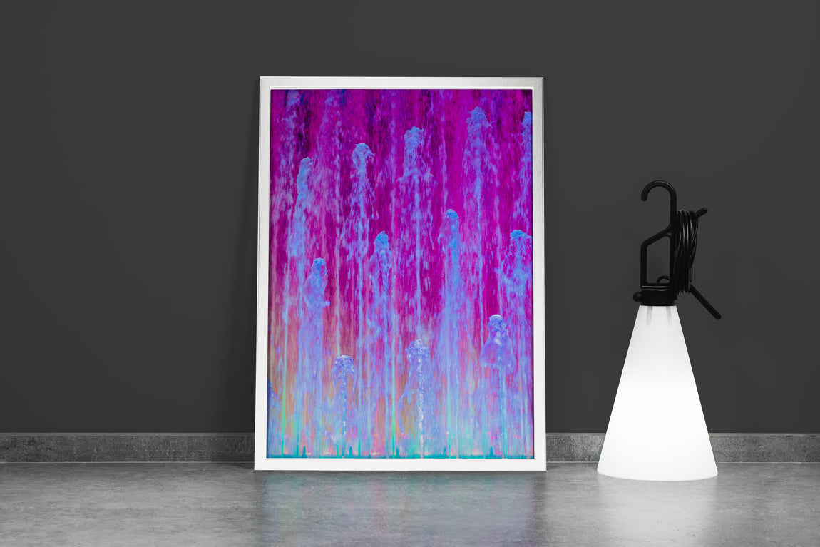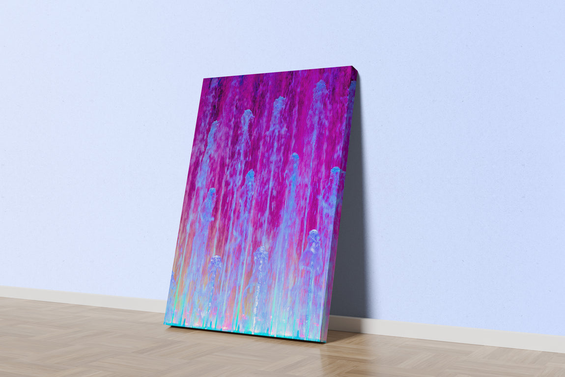 a vibrant night photograph of a water fountain illuminated with pink and blue lights, abstract, art, kanvas tablo