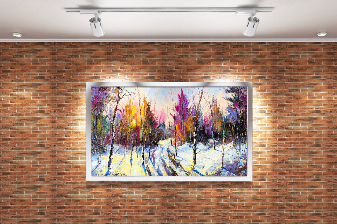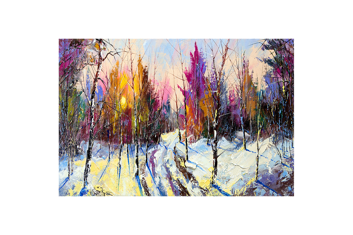 a vibrant palette knife painting of a snowy forest path at sunrise, view, art, kanvas tablo