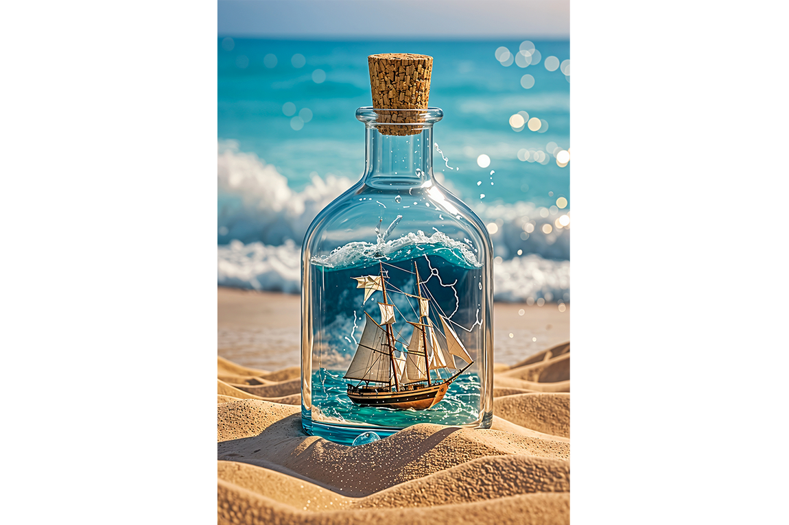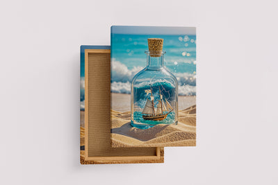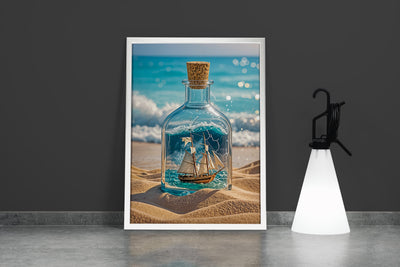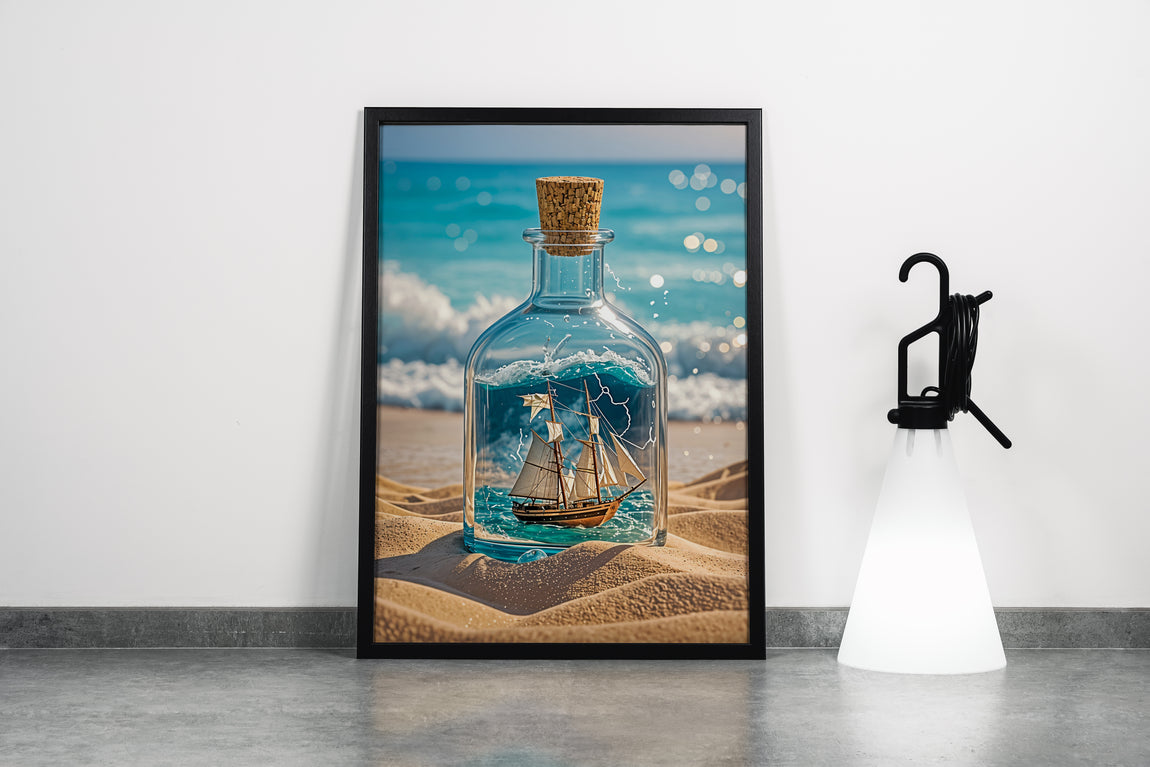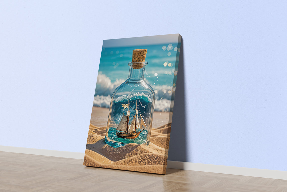ai creation, a bottle washed up on the beach, a ship floating in the water inside the bottle, ai art, art, kanvas tablo