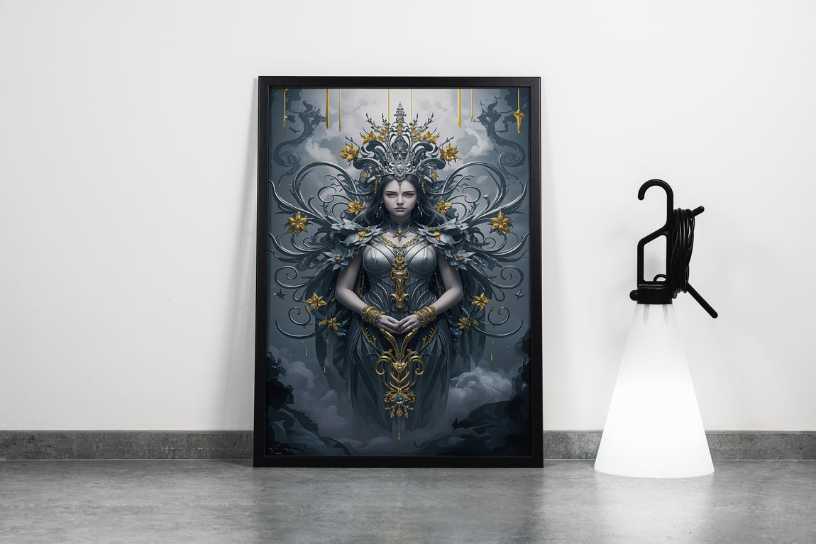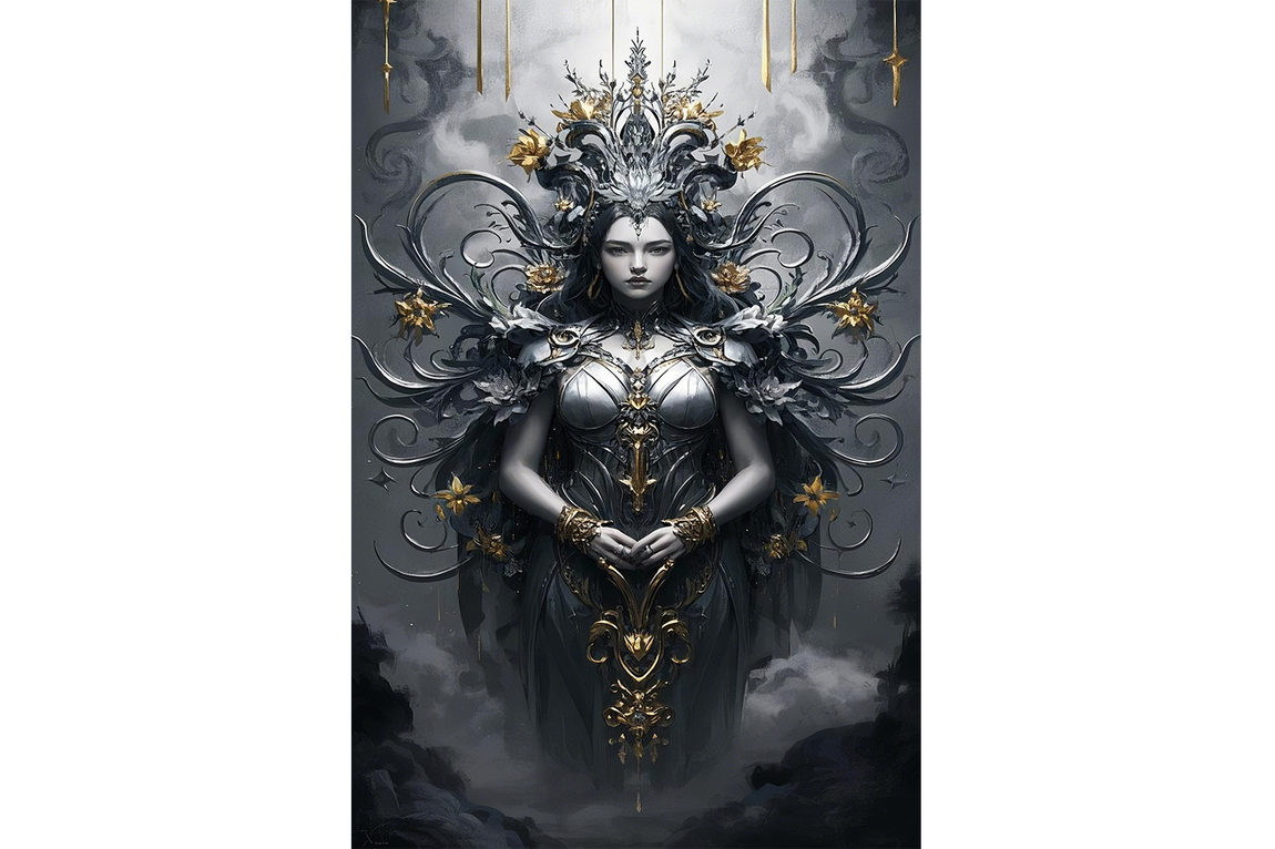 Detaylı işçilikle hazırlanmış baskı, zarif gümüş zırhın karanlık bir tanrıçayı çevrelediği benzersiz bir görsel sunuyor. Altın işlemelerle süslenmiş motifler, her bakışta büyüleyici ayrıntılar ortaya çıkararak dekorasyonunuza sofistike bir hava katıyor. Kaliteli kanvas ve gelişmiş baskı teknikleriyle uzun ömürlü ve canlı renkler garanti ediliyor. Estetik ve güç dolu bu eser, mekanınıza derinlik ve karakter eklemek için ideal.