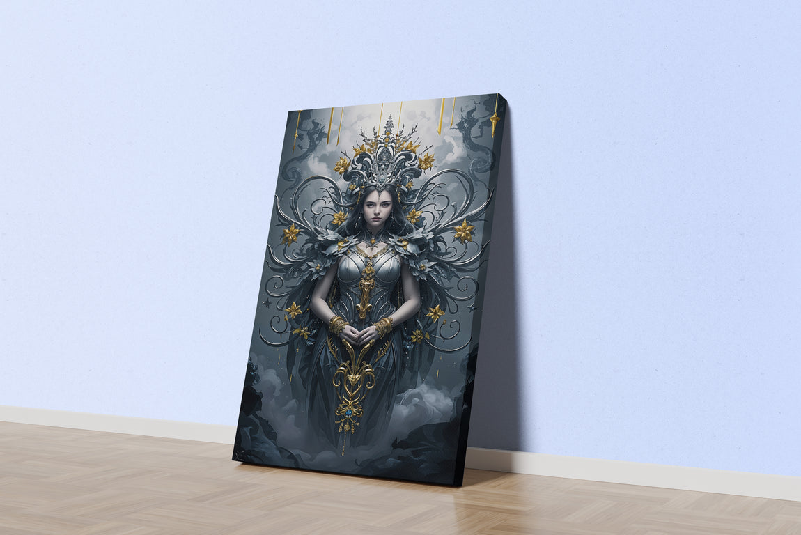 ai creation, a dark goddess in intricate silver armor with ornate gold filigree details, ai art, art, kanvas tablo