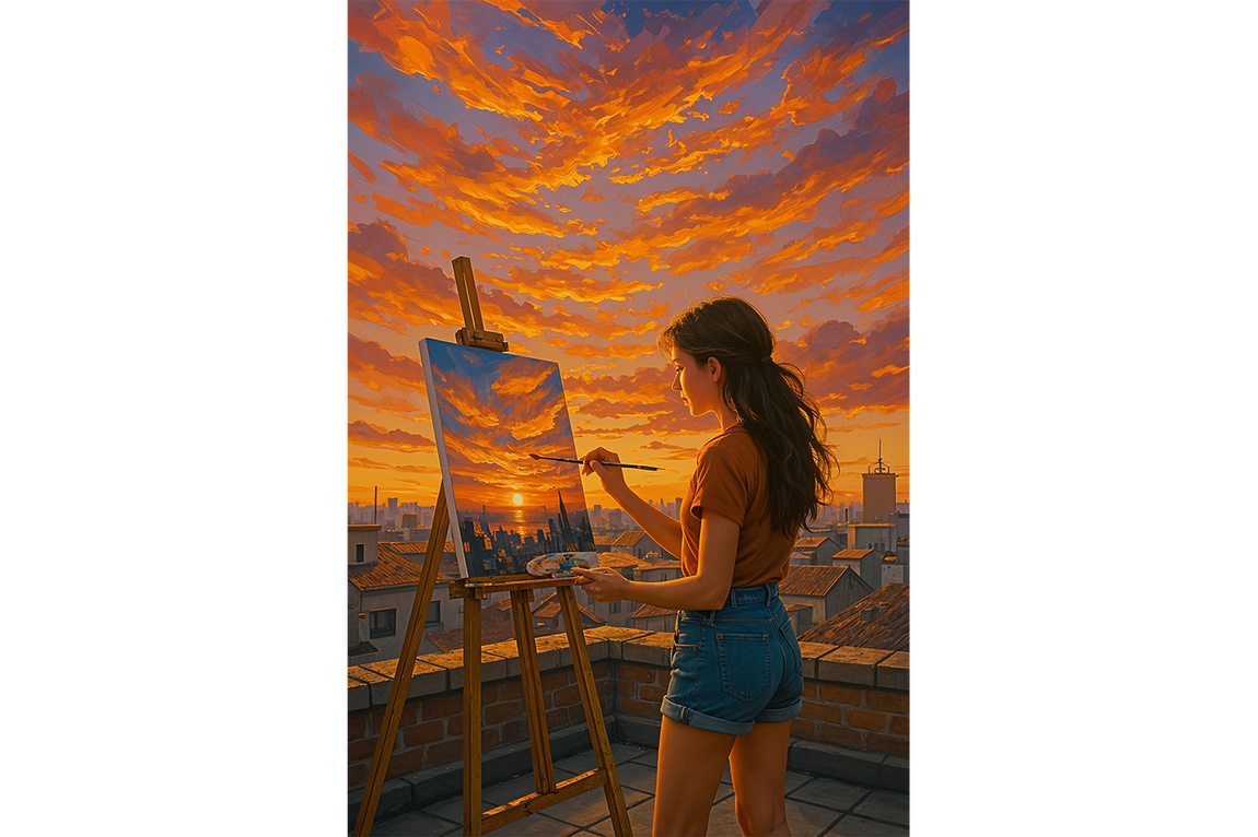 ai creation, a female artist who paints nature on the roof of her house, ai art, art, kanvas tablo