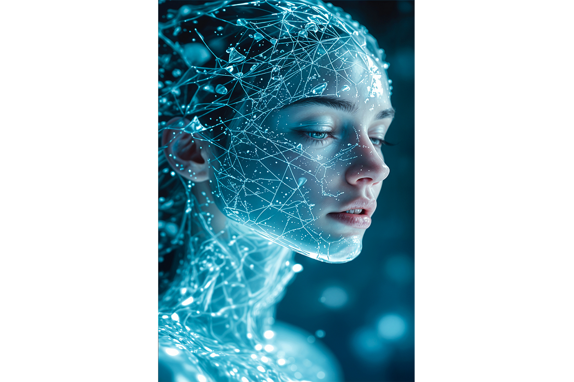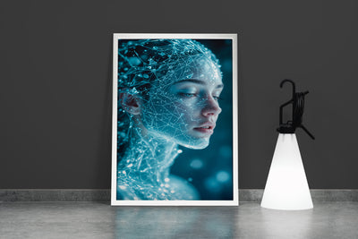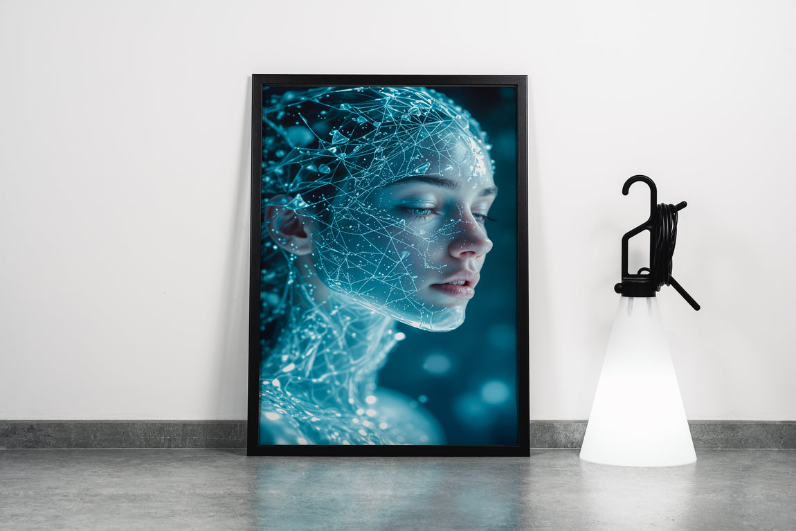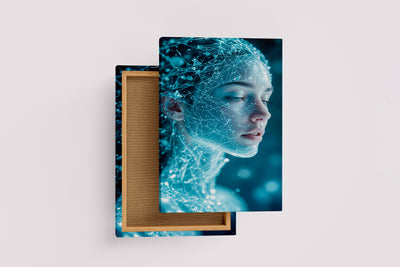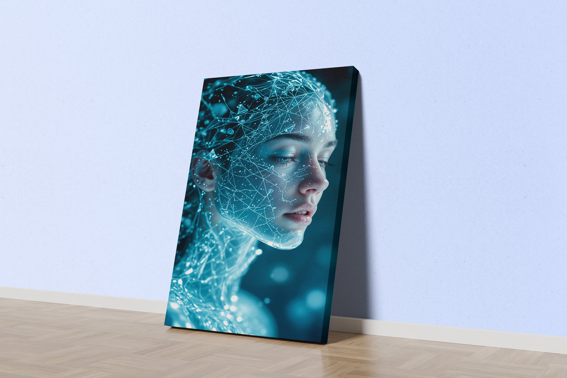 Parlak mavi ışıklarla oluşturulmuş dijital sinir ağı detayları, futuristik bir kadının yüzünü benzersiz şekilde yansıtıyor. Yüksek kaliteli baskı sayesinde canlı renkler ve keskin detaylar uzun ömürlü kullanım sunar. Modern ve teknolojik atmosferler yaratmak isteyenler için ideal bir dekorasyon seçeneği.