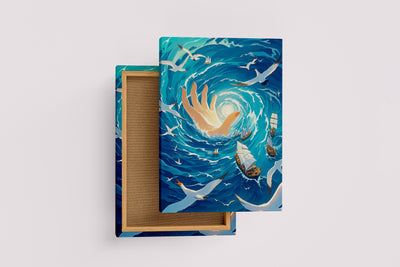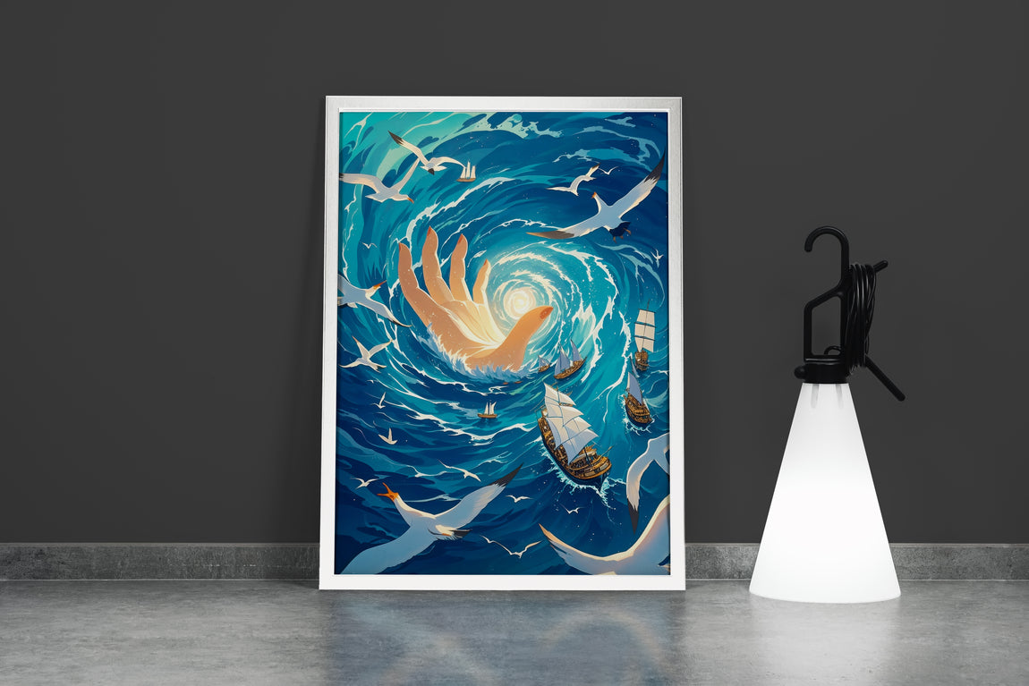 Denizin ortasında devasa ve ışık saçan bir el, etrafında dönen girdapla güçlü bir atmosfer yaratıyor. Deniz üzerindeki gemiler detaylı baskıyla hayat bulurken, her izleyiciye etkileyici ve dinamik bir manzara sunuyor. Kaliteli baskı tekniği sayesinde renkler canlı ve dayanıklı, mekanınıza derinlik ve hareket katmak için mükemmel bir tercih.