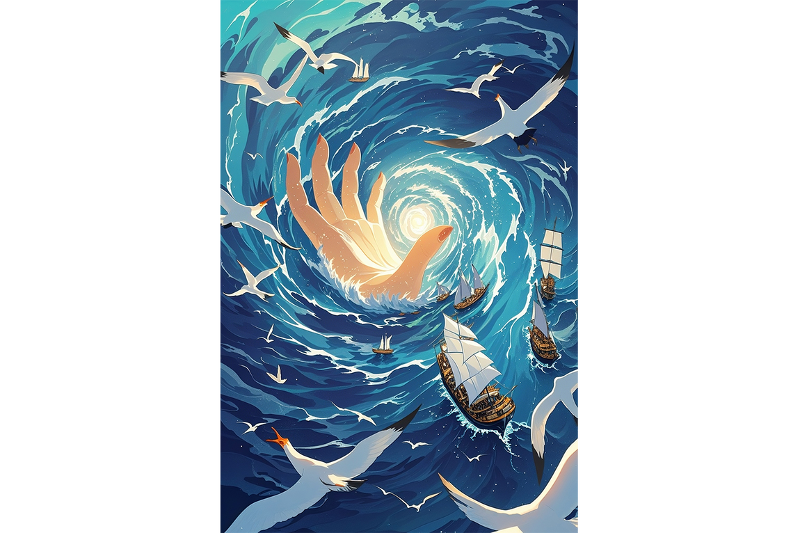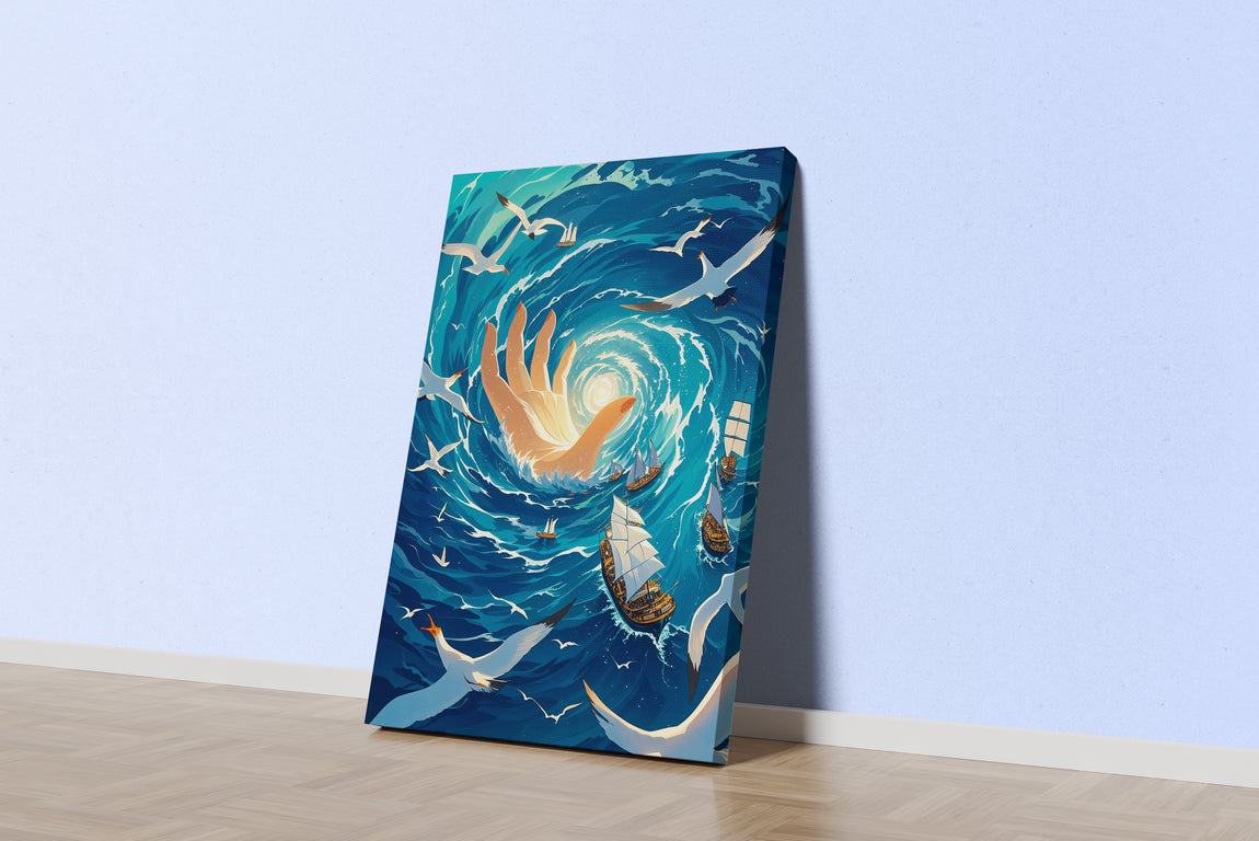 ai creation, a giant glowing hand creating a whirlpool in the sea with ships, ai art, art, kanvas tablo