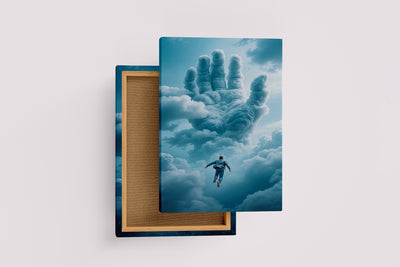 Gökyüzünde düşen bir adamı nazikçe kavrayan dev bir bulut eli tasviri, ince detaylarla yüksek kalitede dijital baskı ile hayat buluyor. Canlı renkler ve net çizgilerle üretilen bu baskı, modern dekorasyonunuza derin anlam ve estetik katarken, mekana mistik bir hava kazandırır. Hafif ve dayanıklı malzemesi sayesinde uzun yıllar kullanım imkanı sunar.