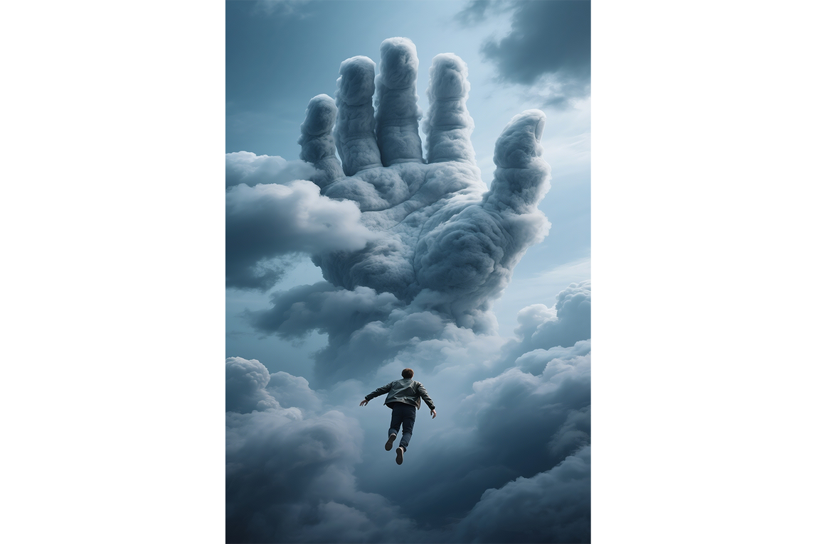 ai creation, a giant hand of clouds reaching for a man falling through the sky, ai art, art, kanvas tablo