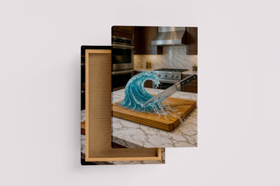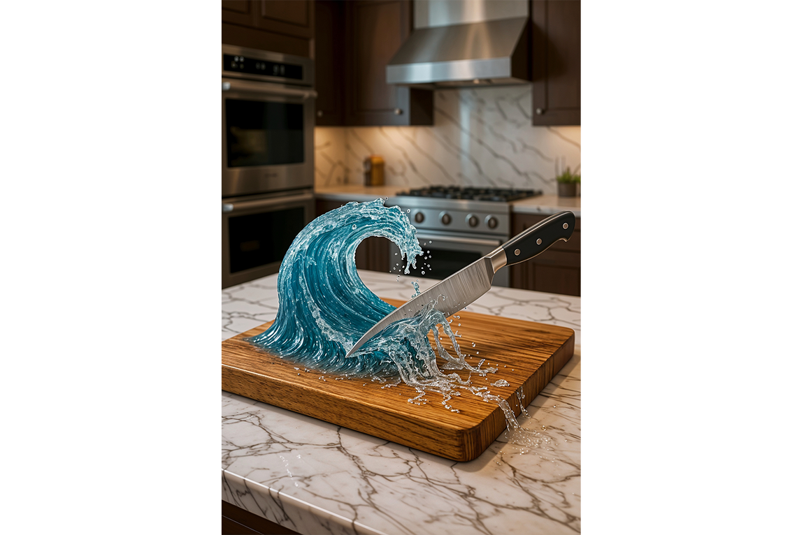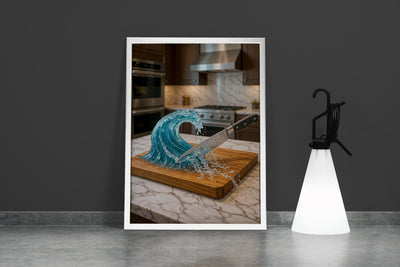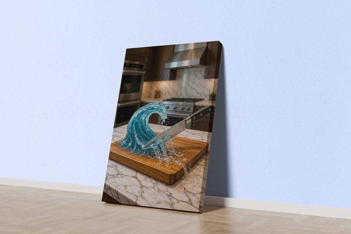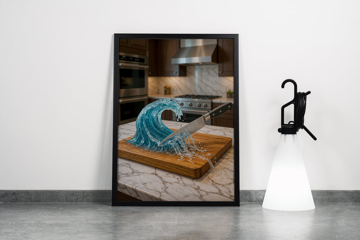 ai creation, a knife that cuts the water wave on the board on the kitchen counter, ai art, art, kanvas tablo
