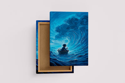 ai creation, a man sitting in a basket floating in giant waves, ai art, art, kanvas tablo