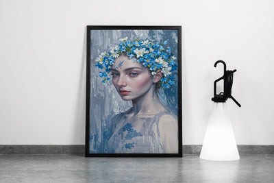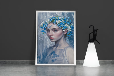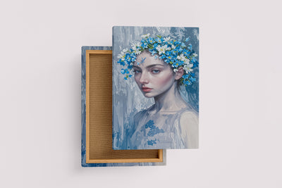 Zarif mavi ve beyaz çiçeklerden oluşan bir taçla süslenmiş kadın portresi, yüksek çözünürlüklü baskı kalitesiyle öne çıkıyor. Detayların canlılığı ve renklerin dengesi, dekorasyonunuza sofistike ve sanatsal bir dokunuş katacak. Dayanıklı kanvas yüzey üzerinde üretilen baskı, uzun ömürlü kullanım sağlar. Mekanınızda estetik bir atmosfer yaratmak için ideal bir seçim.
