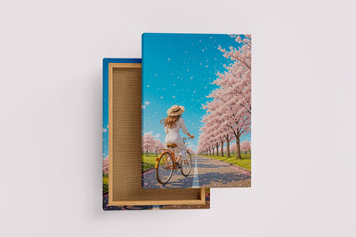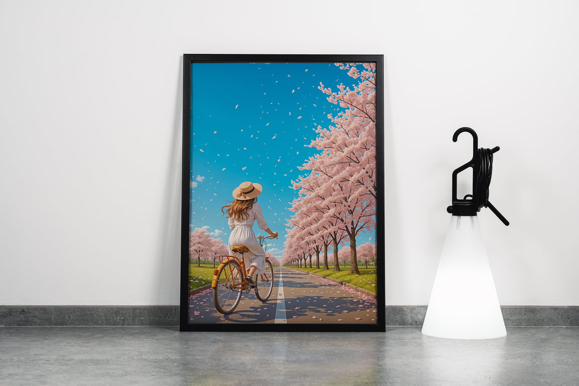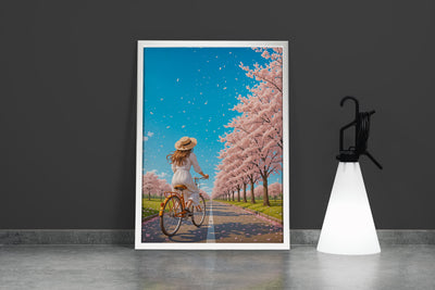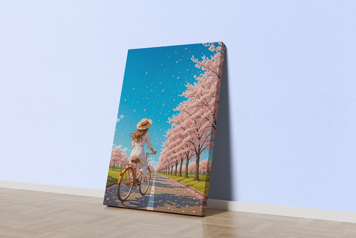 Yumuşak pembe ağaçlarla çevrili sakin bir yol ve şapkalı bir kızın bisiklet sürüşü, bu baskıda hayat buluyor. Canlı renkler ve detaylarla zenginleştirilen baskı, mekânınıza huzur ve estetik katıyor. Kaliteli kanvas üzerinde özenle hazırlanmış olması, uzun ömürlü ve etkileyici bir dekor sunar. Doğal atmosferi evinizde hissetmek için ideal bir seçim.