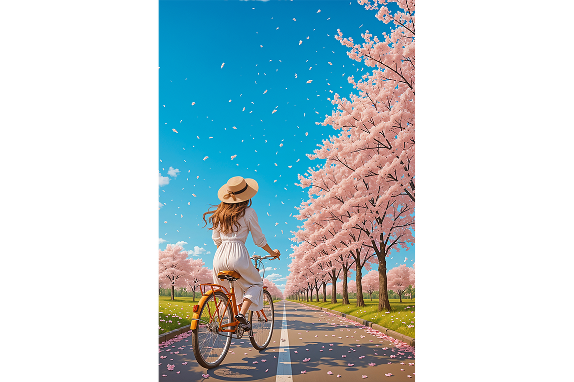 ai creation, a road decorated with soft pink trees with a girl on a bike with a hat, ai art, art, kanvas tablo