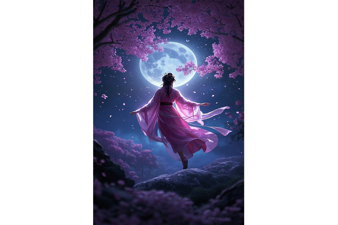 ai creation, a woman in a pink kimono under a full moon and cherry blossoms, ai art, art, kanvas tablo