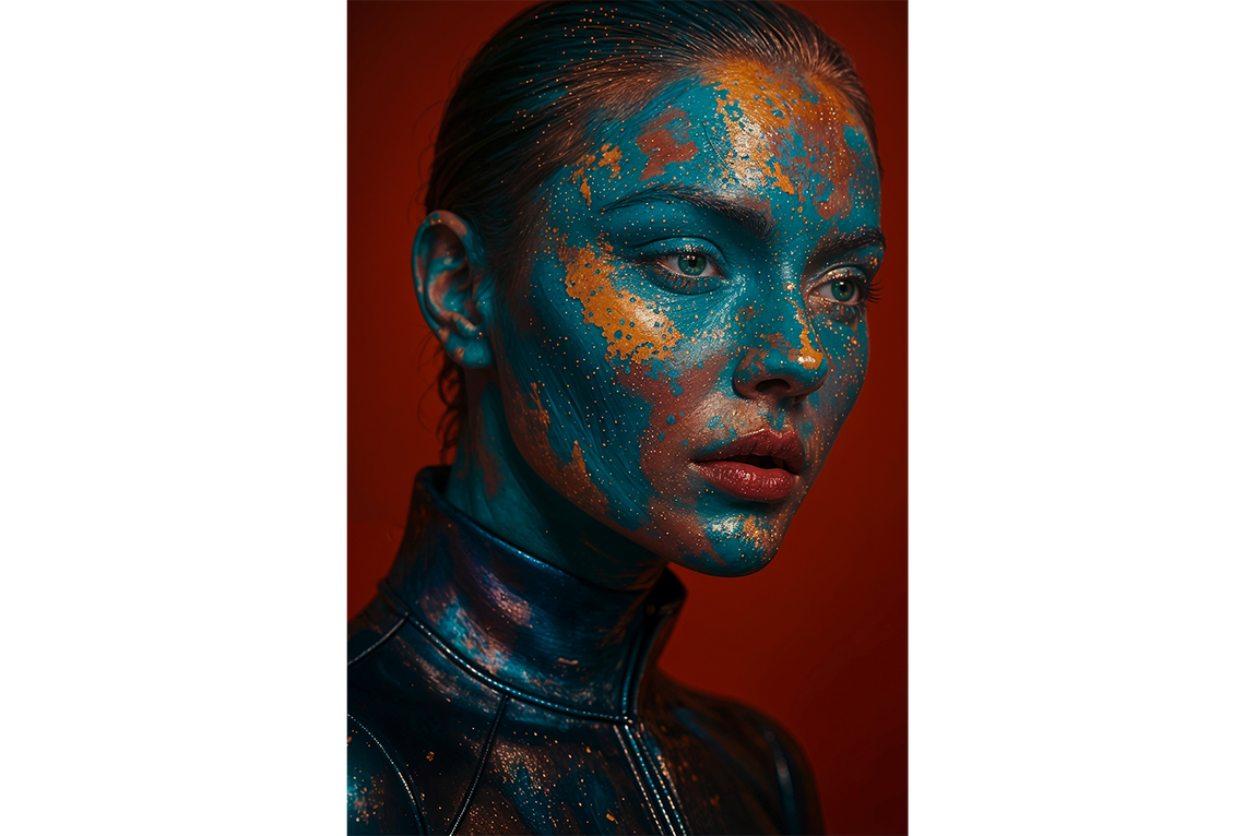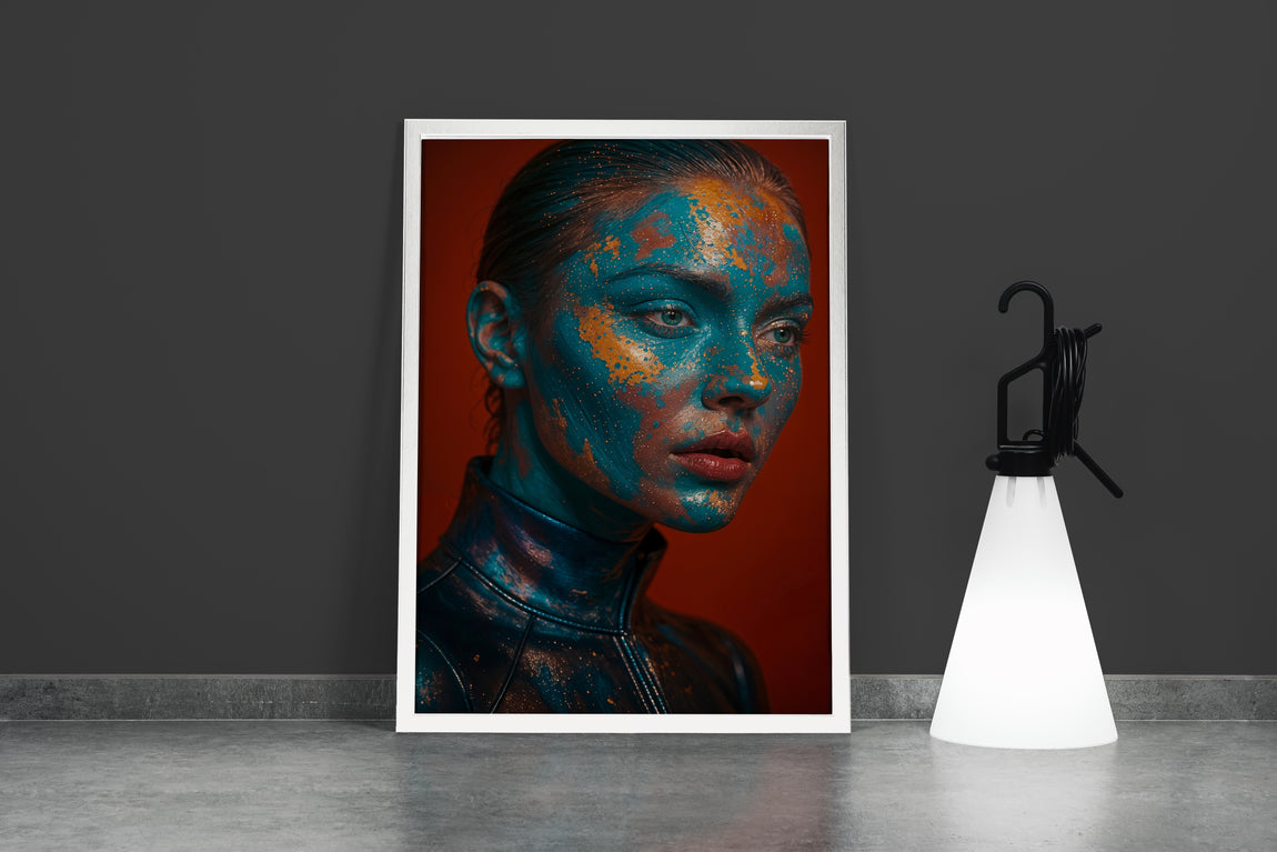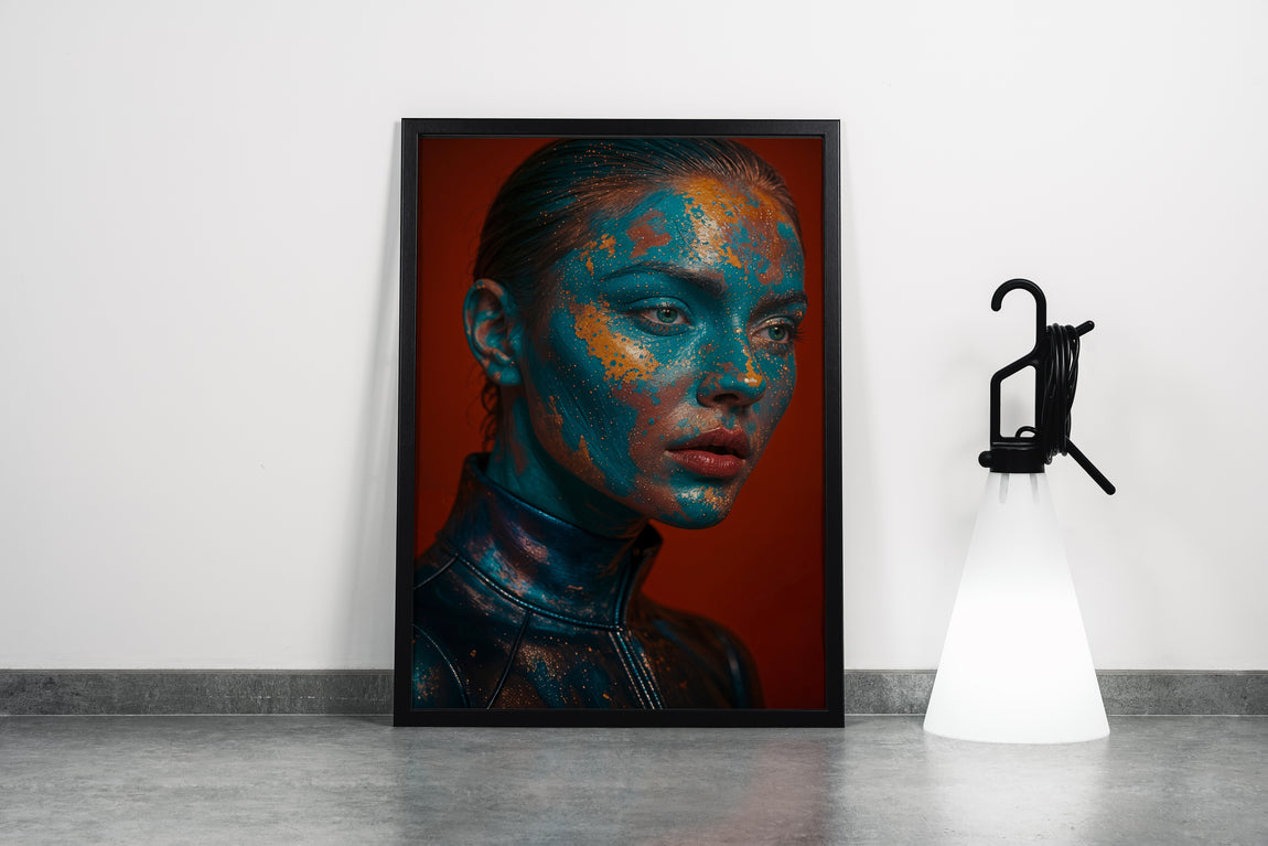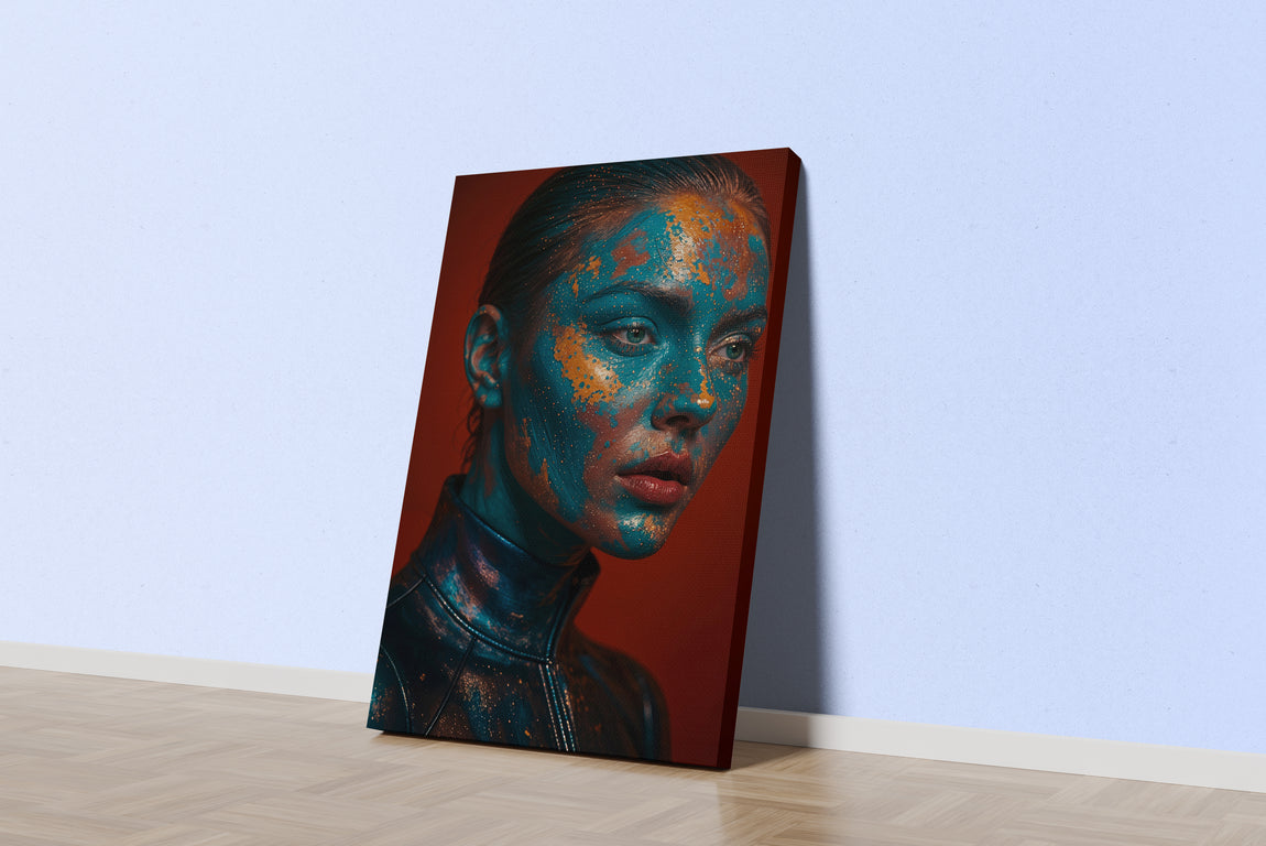 ai creation, a womans face with turquoise and gold artistic paint, ai art, art, kanvas tablo