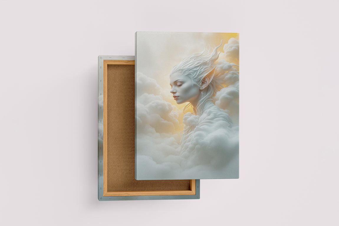 ai creation, an ethereal air spirit with pointed ears, her body made of clouds, ai art, art, kanvas tablo