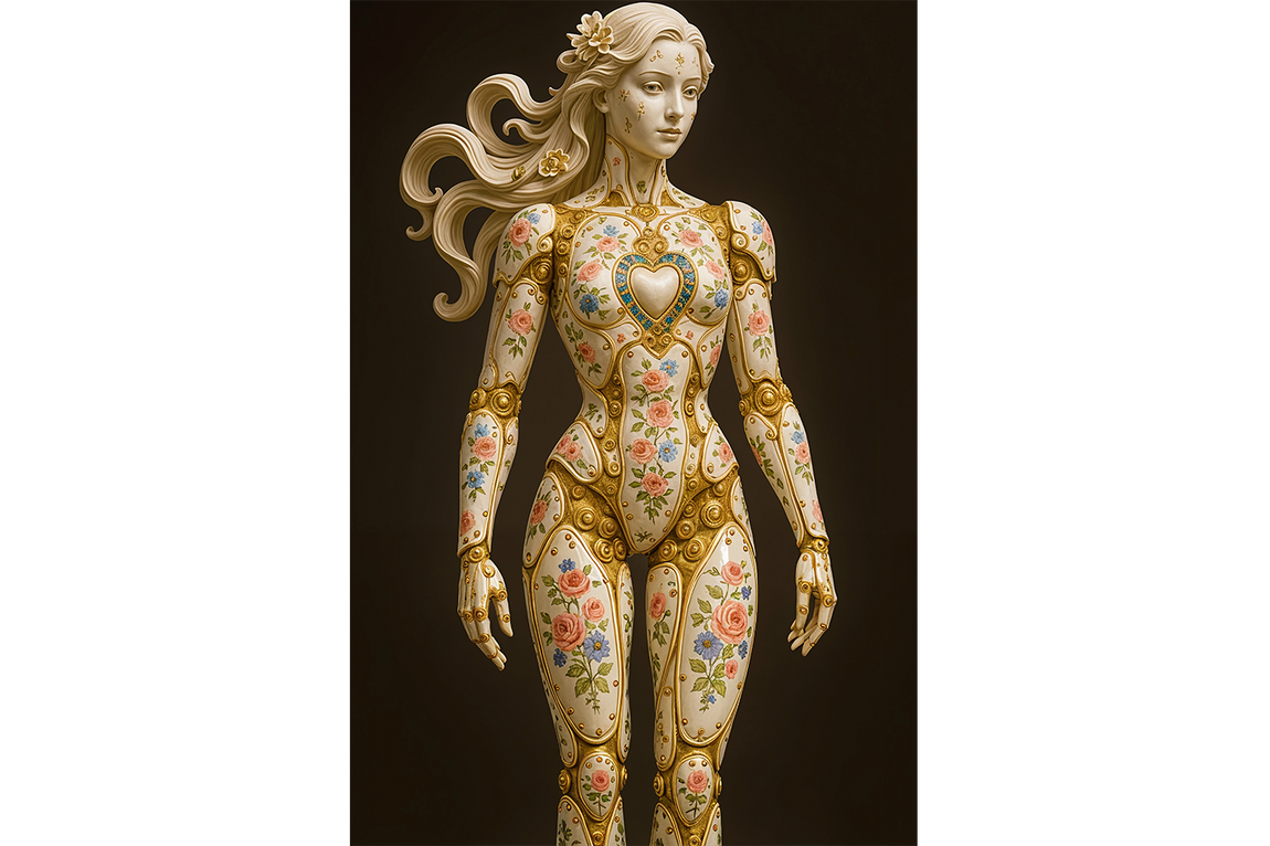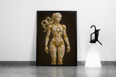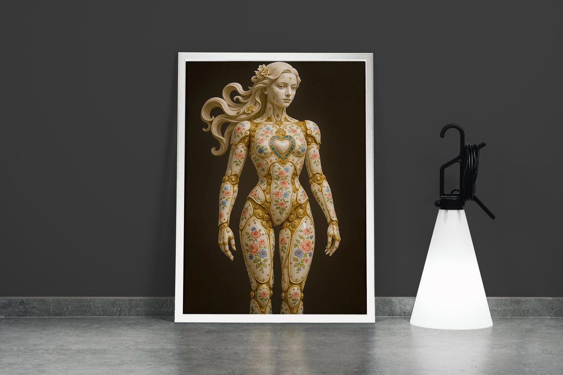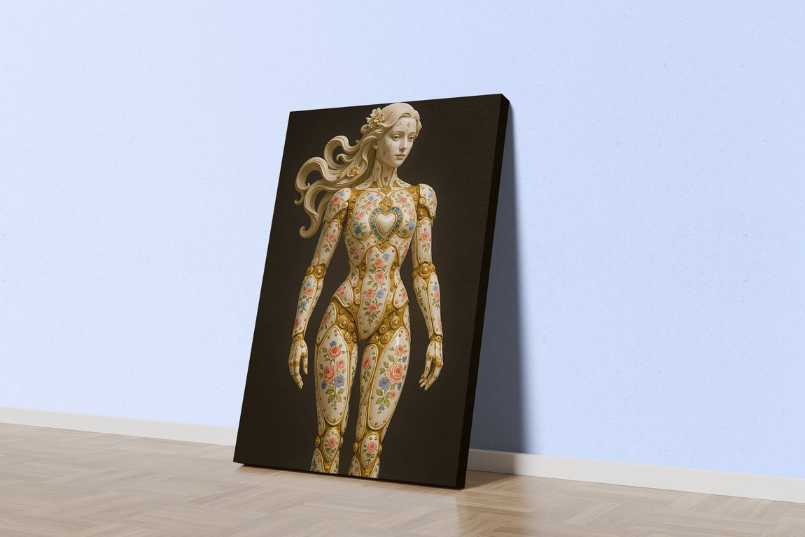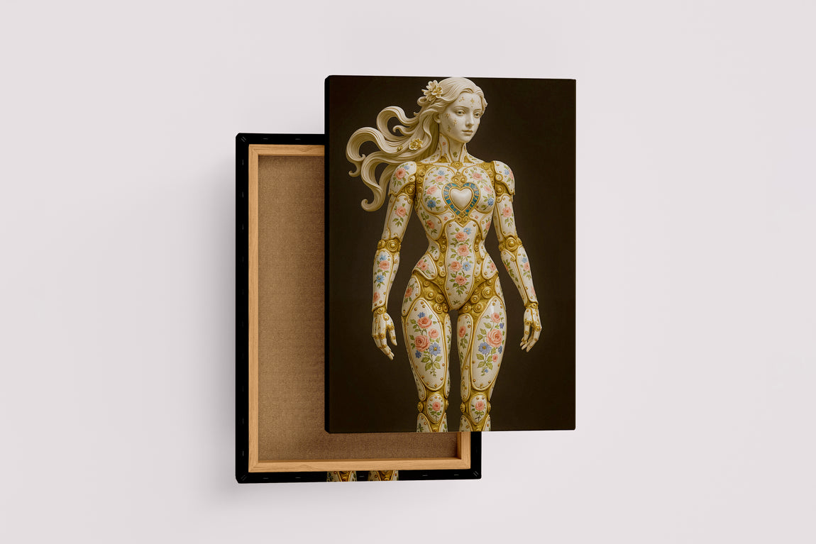 ai creation, an ornate rococo automaton of porcelain and gold, painted with delicate flowers, ai art, art, kanvas tablo