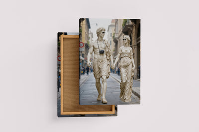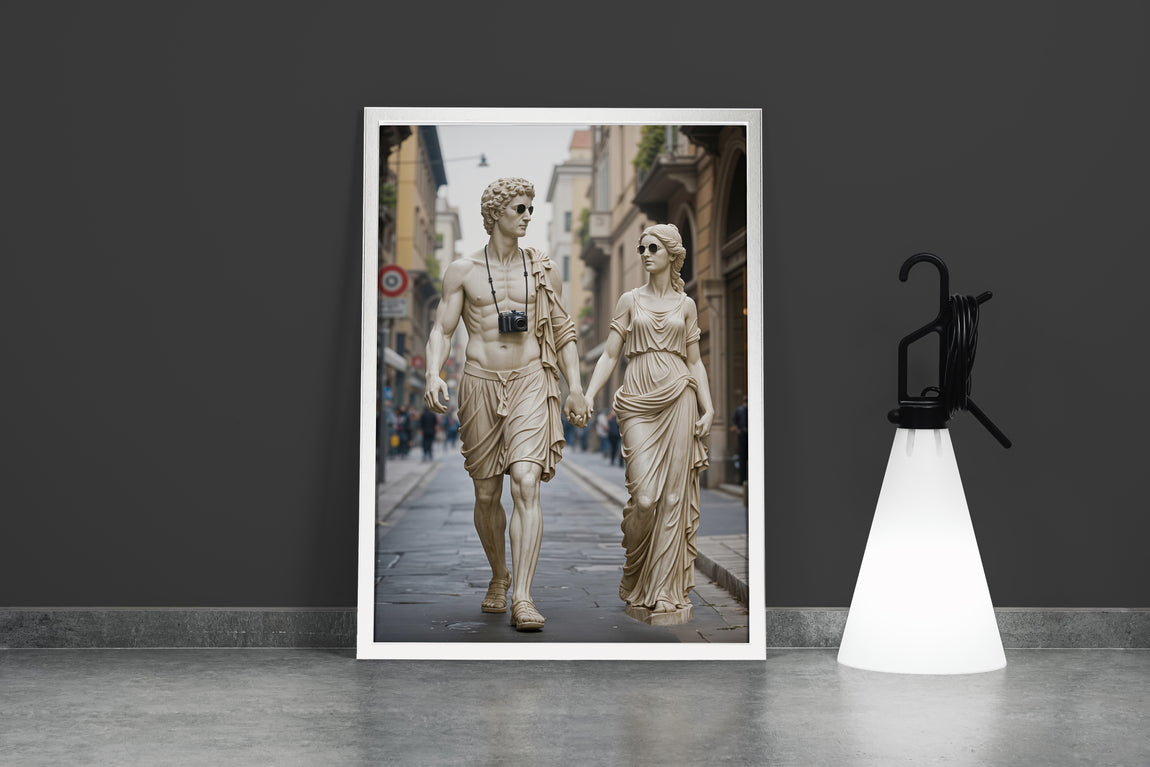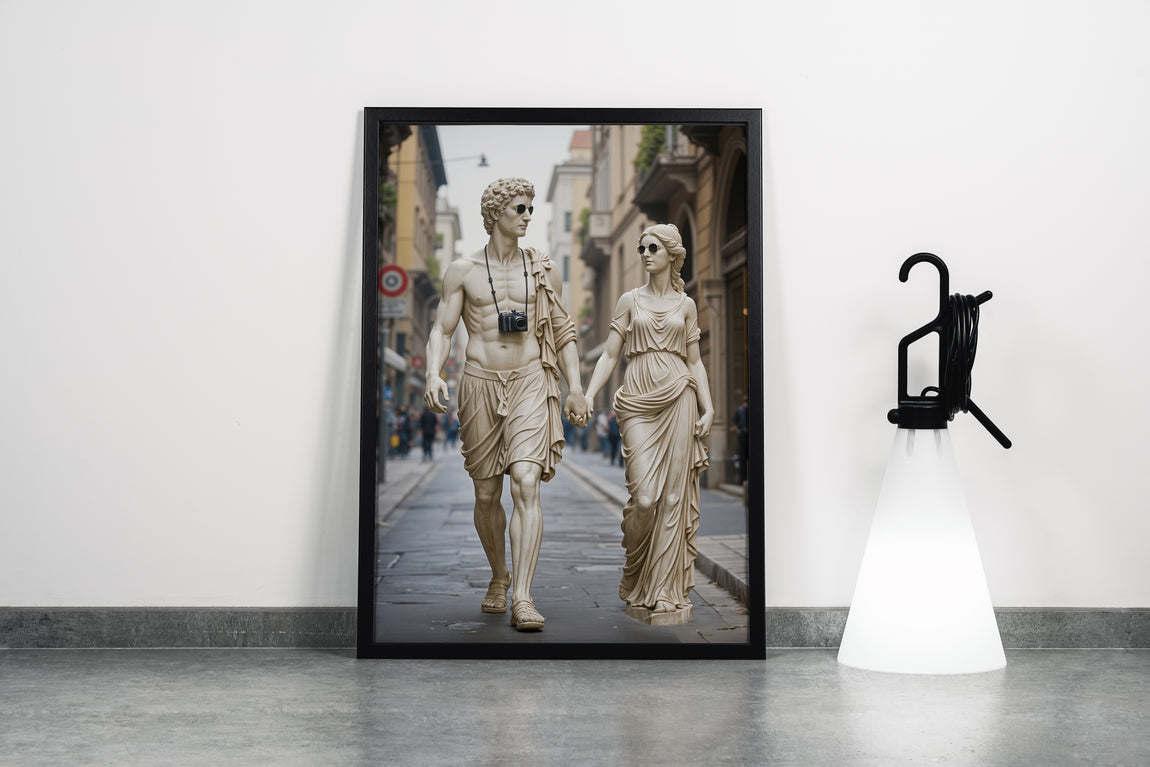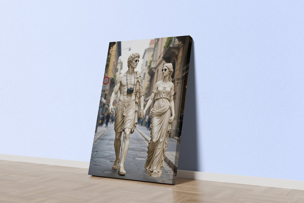 Antik Yunan heykellerinin modern bir dokunuşla, güneş gözlüğü ve fotoğraf makinesiyle günlük hayatın içinde canlandığı bu baskı, sanat ve mizahı bir araya getiriyor. Canlı renkler ve detaylı işçilik sayesinde dekorasyonunuza enerjik ve sıra dışı bir hava katacak. Kaliteli malzemeye yapılan baskı, uzun ömürlü kullanım ve canlı renklerin korunmasını sağlar. Mekanınıza etkileyici ve güncel bir sanat eseri eklemek isteyenler için ideal bir seçenek.